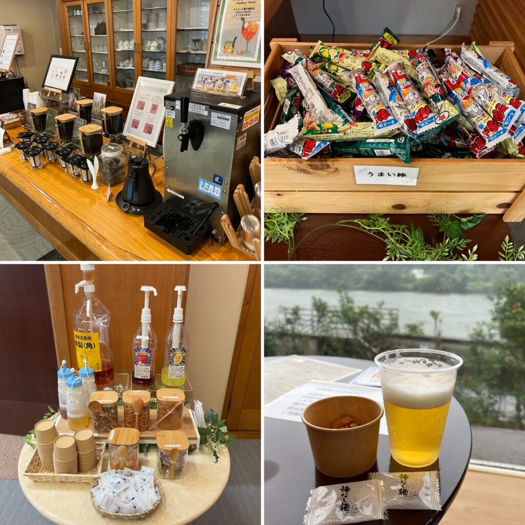 13時チェックインで翌13時までの24時間ステイ。ソフトドリンクは13時から、お酒は16時からのオールインクルーシブに、ナッツやうまい棒のおつまみもあります。