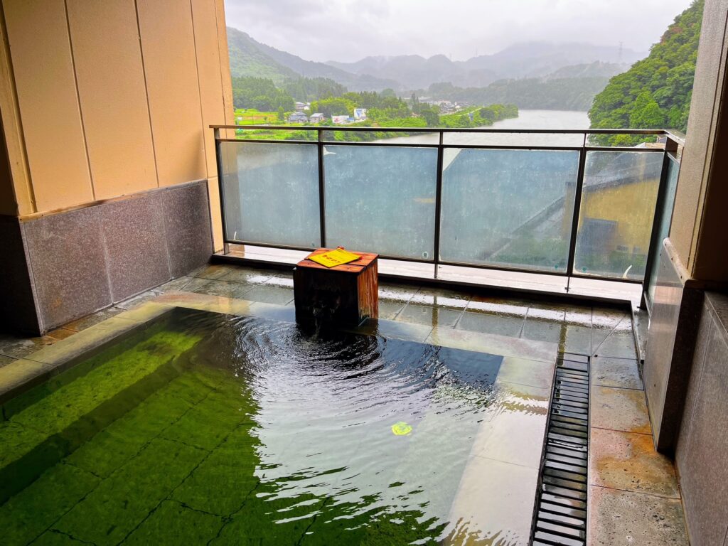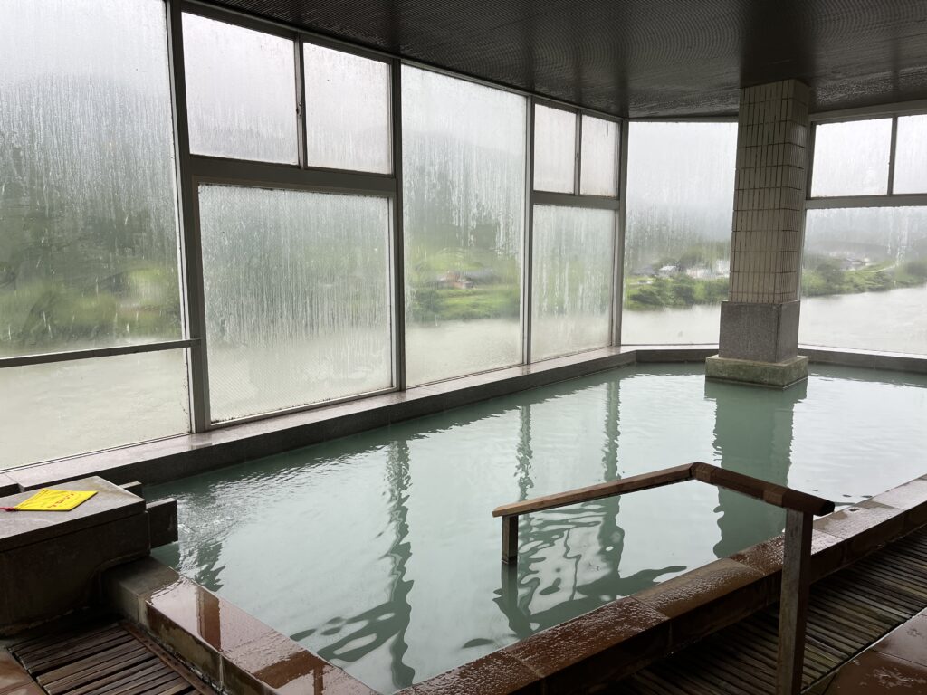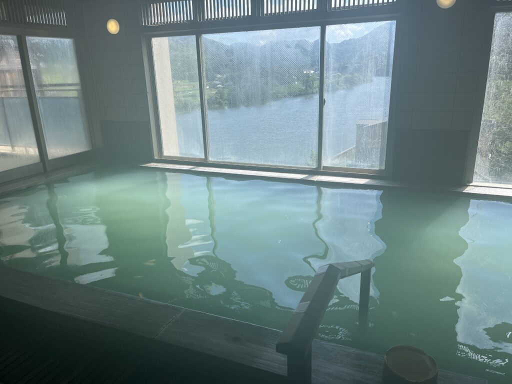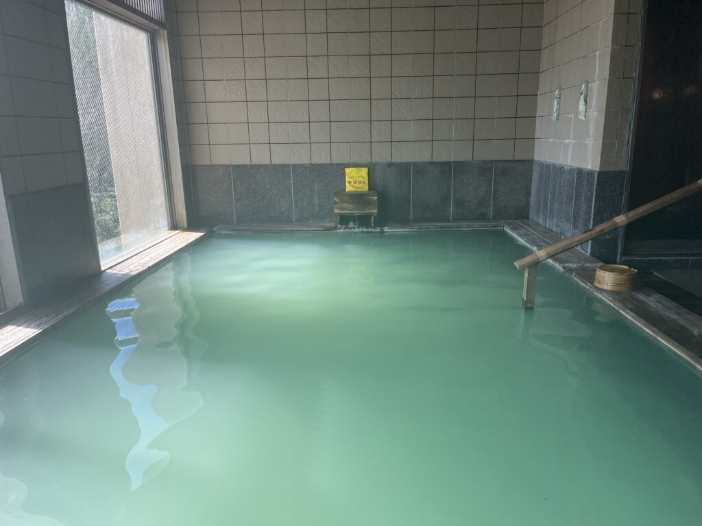 温泉は硫化水素が香る硫黄泉。宿泊当日は内風呂が白濁で露天風呂がエメラルドグリーンでしたが、翌朝は内風呂が白濁のエメラルドグリーンで露天風呂は透明でした。