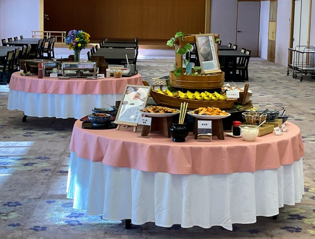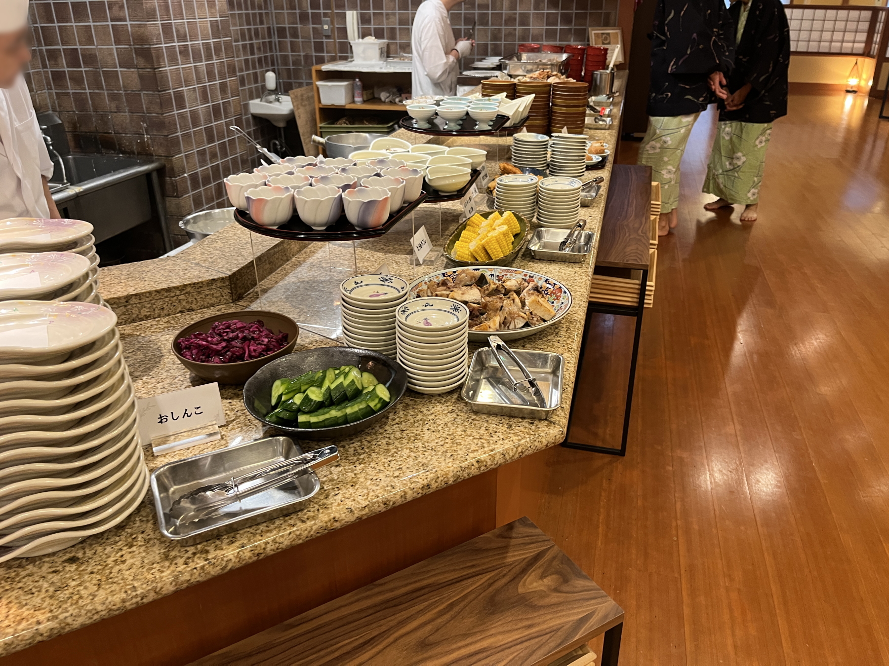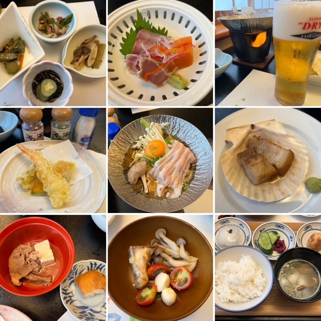 夕食は季節の小鉢や海の幸三種盛り、雪国育ちの「純白のビアンカ豚」の鍋のほか、ライブキッチンで天婦羅や角煮や小鉢料理がいただけます。お酒もセルフで飲み放題です。