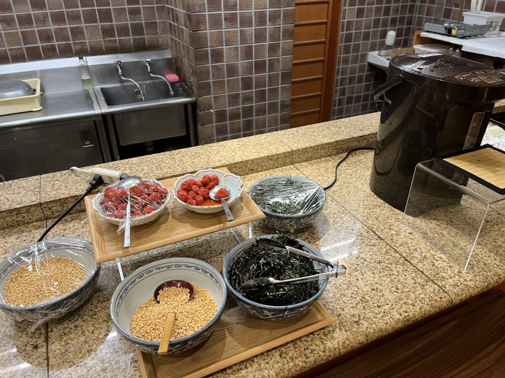 21時から夜食(お茶漬け)があります。翌日は昼食にお揚げとなめこのうどんをいただきました。1泊3食どころか4食しっかりいただいて、またまた食べ過ぎてしまいました。
