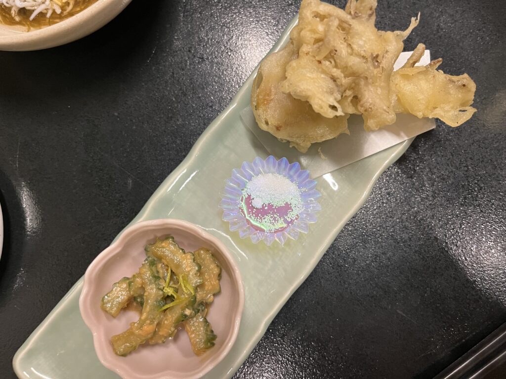 【前 菜】ゴーヤの柚味噌和え 舞茸と無花果の天婦羅