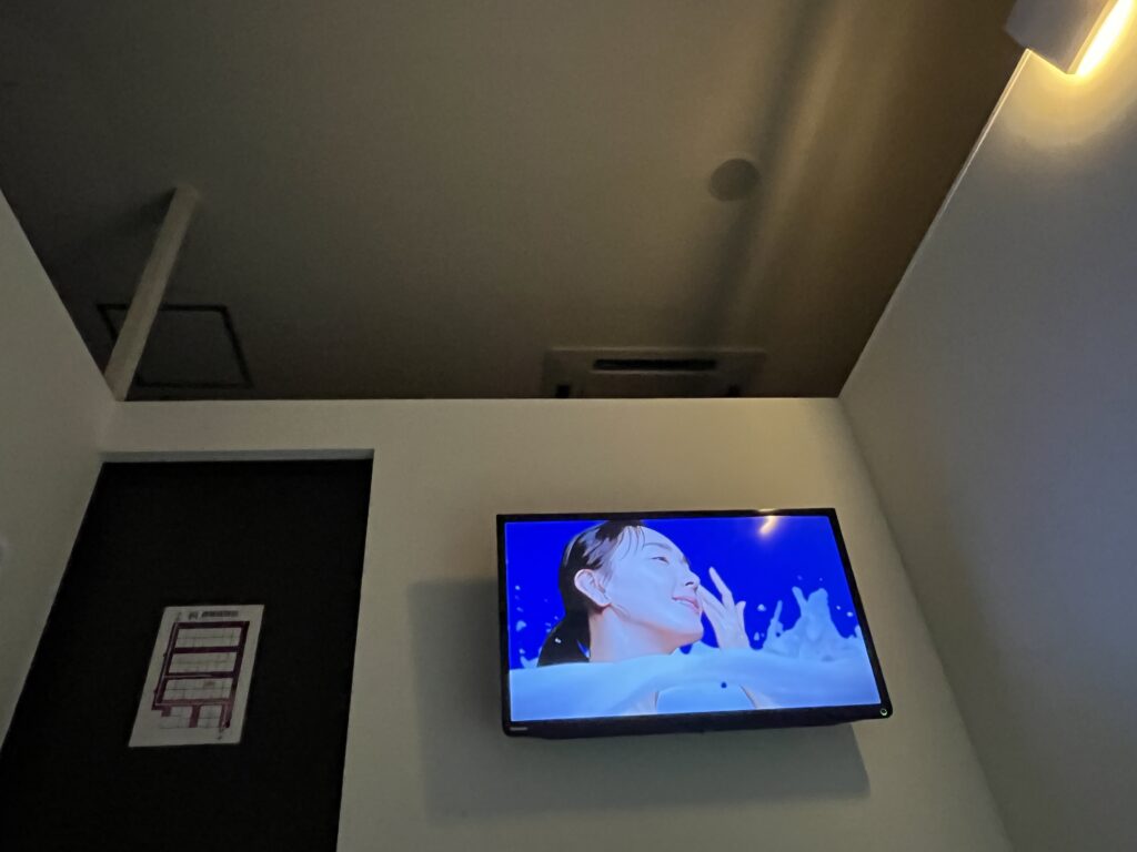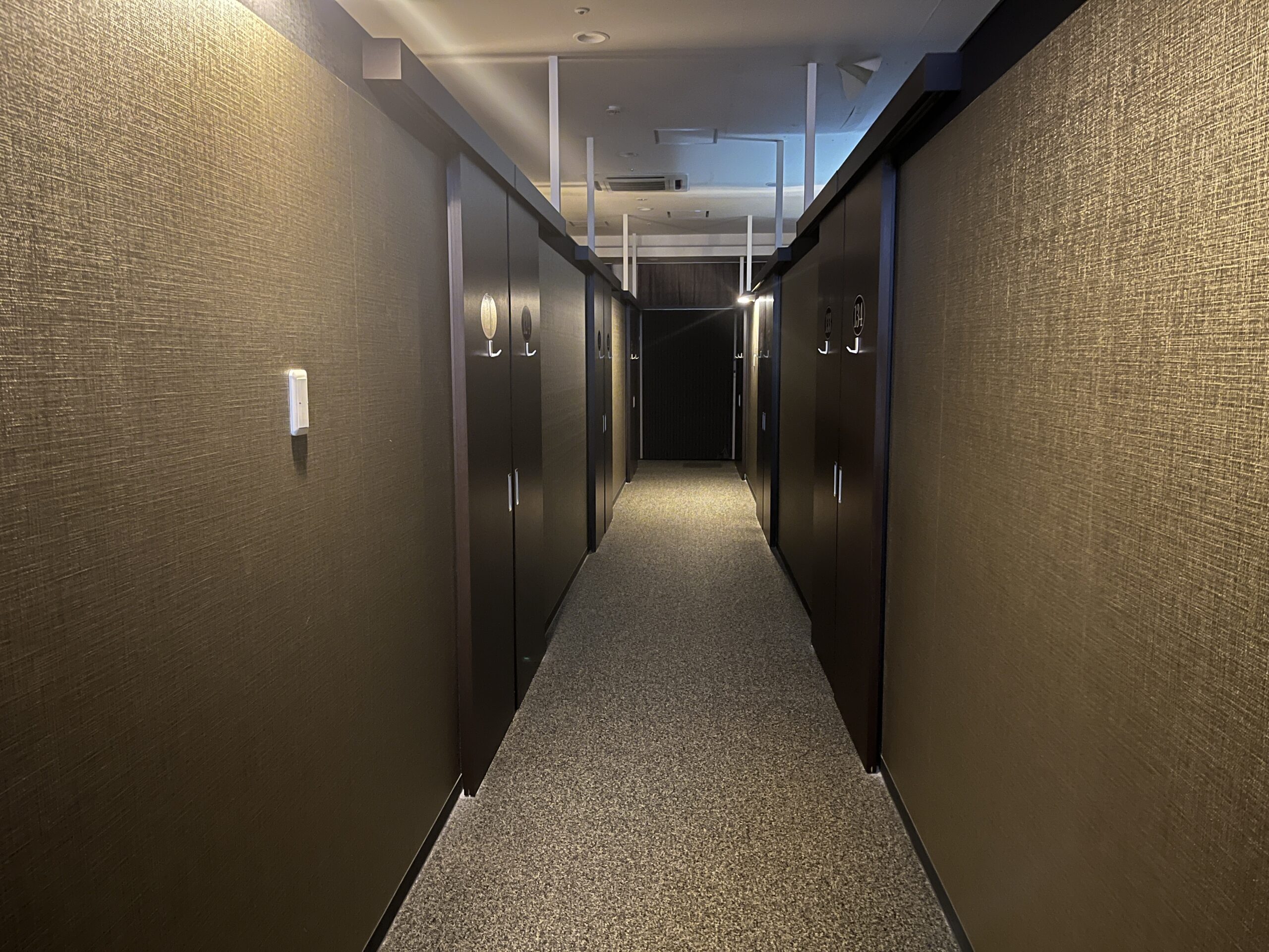宿泊は普通の客室もあるのですが、今回は初めてでワクワクの簡易宿泊・半個室タイプを選択しました。部屋は消防法の関係で施錠ができません。2mチョットの壁の上は男性宿泊エリア全体が吹き抜けで繋がっています。ということは‥‥。