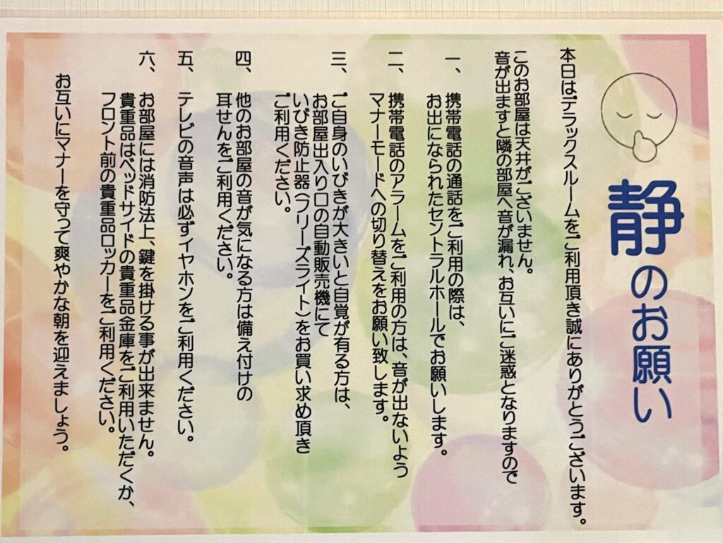 夜になると誰かのイビキが聞こえてきます。夜中3時過ぎに目が覚めましたが、3~4人分のイビキは備え付けの耳栓を使っても聞こえます。覚悟の上での宿泊でしたが、その日によって当たり外れがあるのだと思いました。