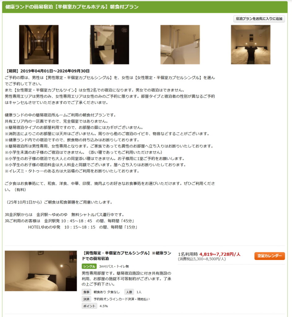 健康ランドの簡易宿泊【半個室カプセルホテル】朝食付プラン