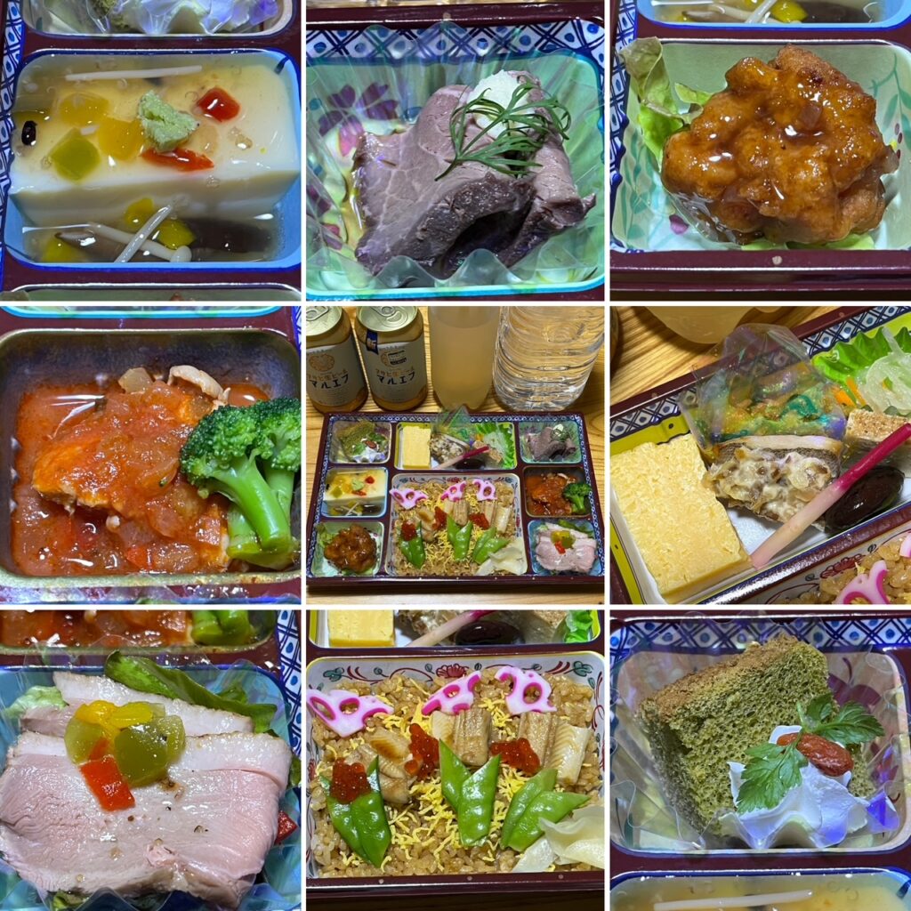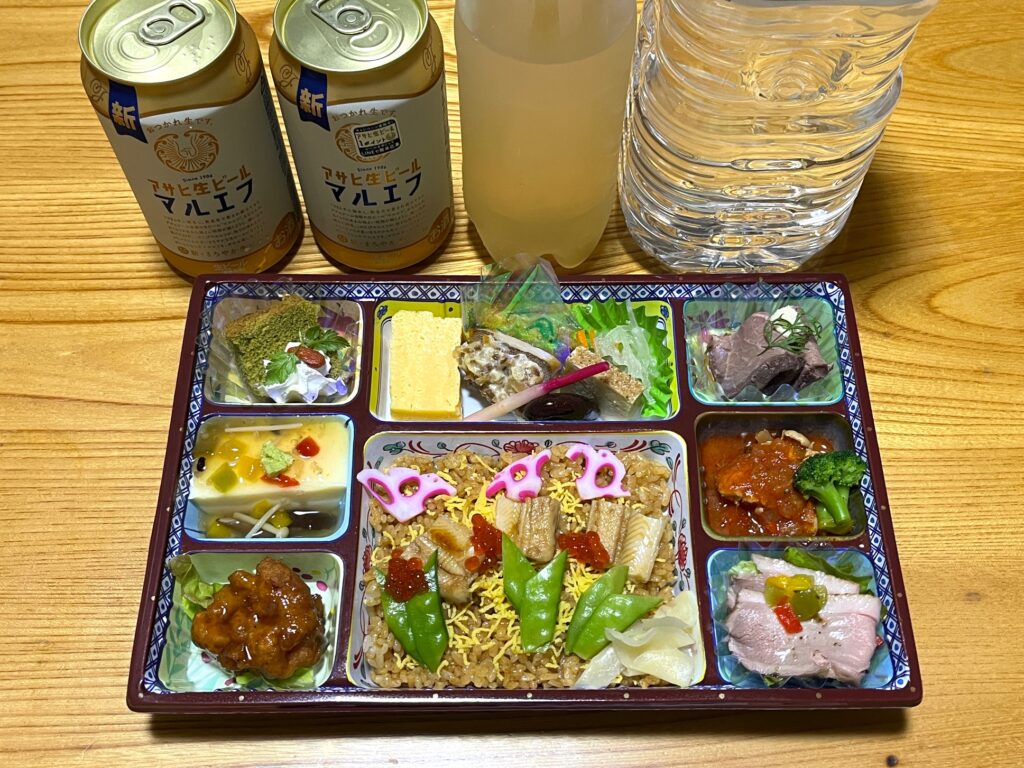 18時にレストランへ弁当を取りに行きます。箱から取り出した特製弁当は、添え物やソースなども丁寧に作ってあります。何より部屋飲みでくつろげたのが良かったです。