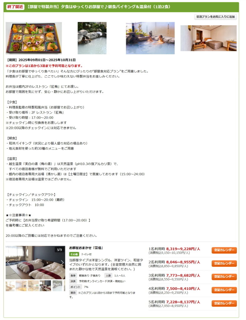 3年前の宿泊時は15,000円以上したのに、今回は9,150円のプランです。食べ過ぎに注意している身にとって、部屋でいただく弁当プランは、かえってありがたいです。