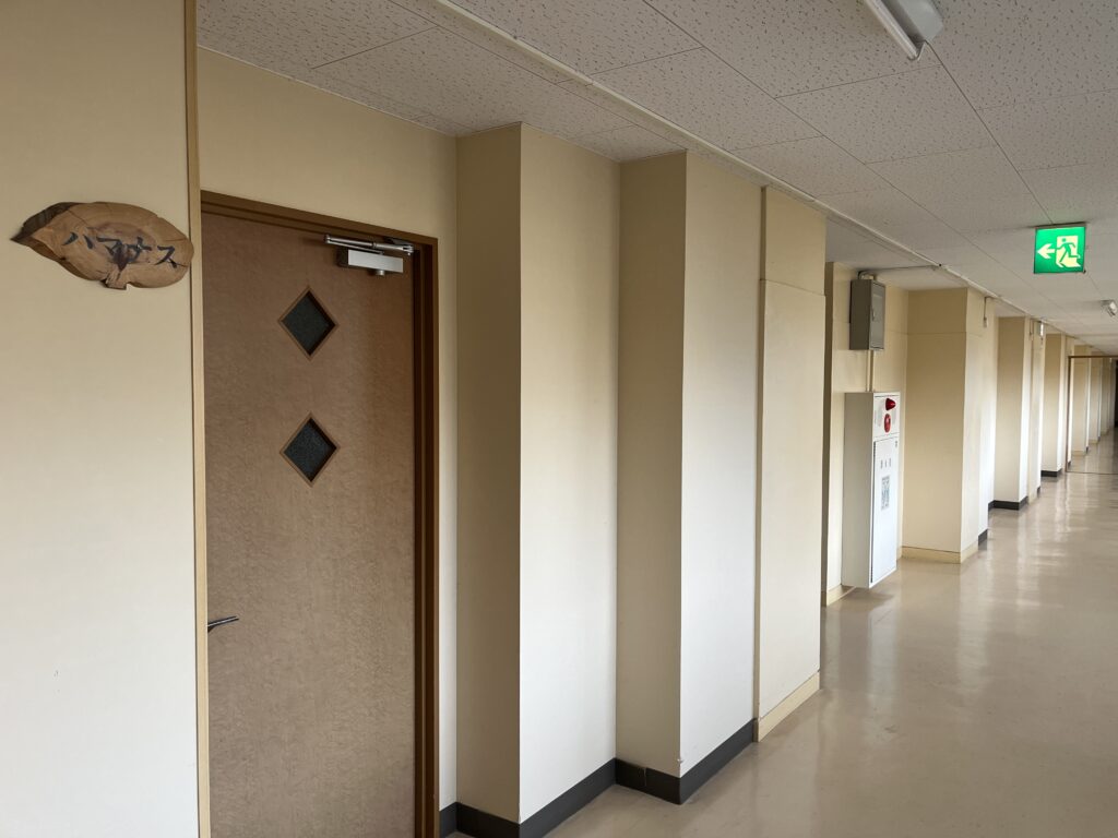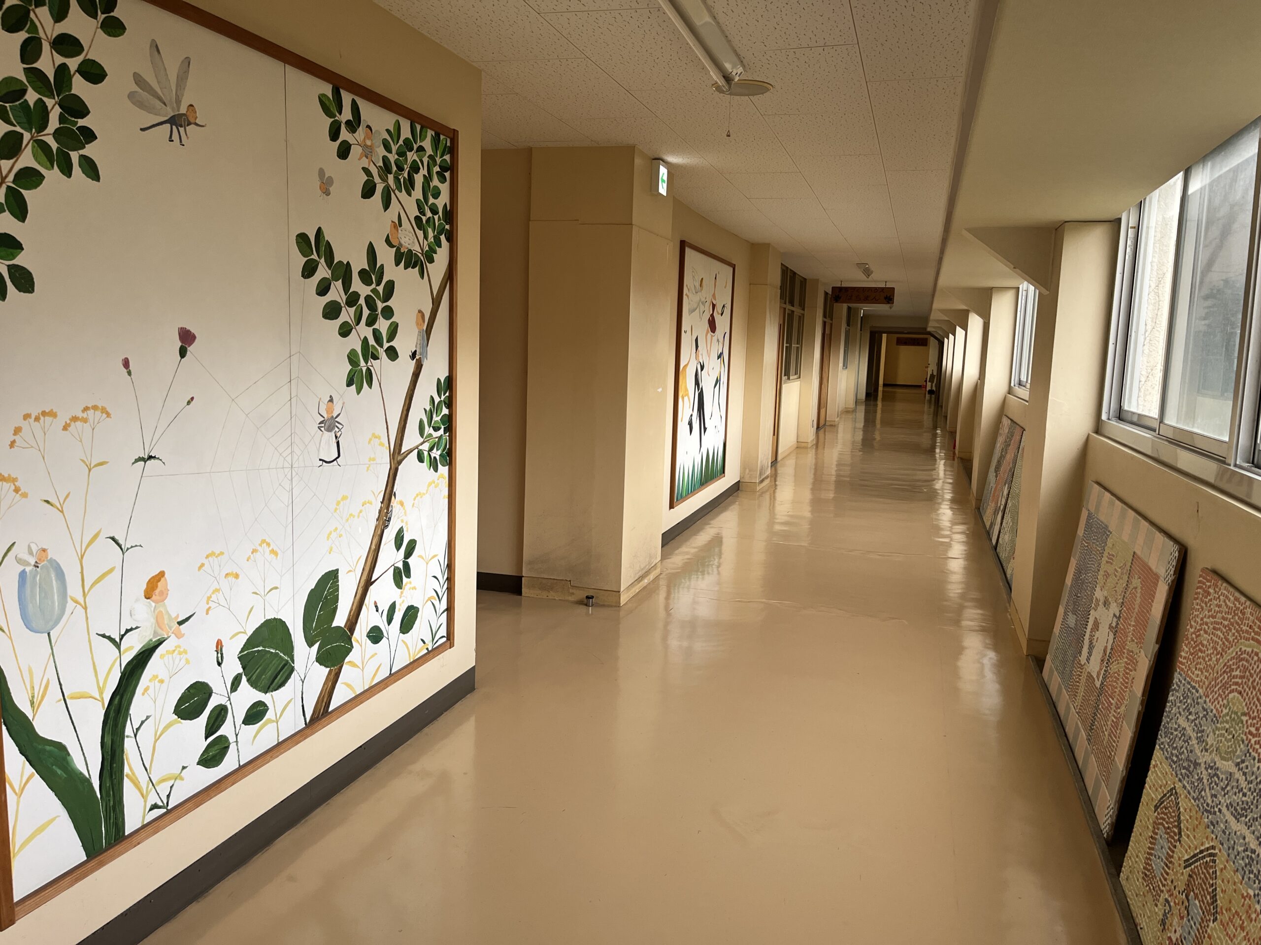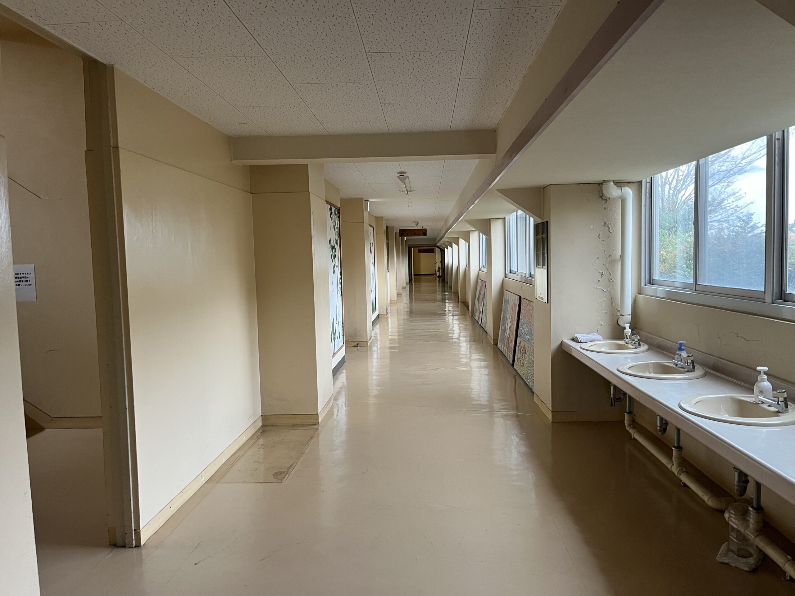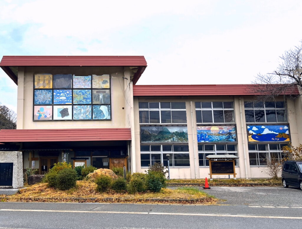 1996年に廃校になった中学校を改装して2001年にオープンした施設です。正面窓の絵画などに当時の面影が残っています。館内は長い廊下と塩ビの床がそのままで、壁には当時の生徒さんが描いた絵画があります。