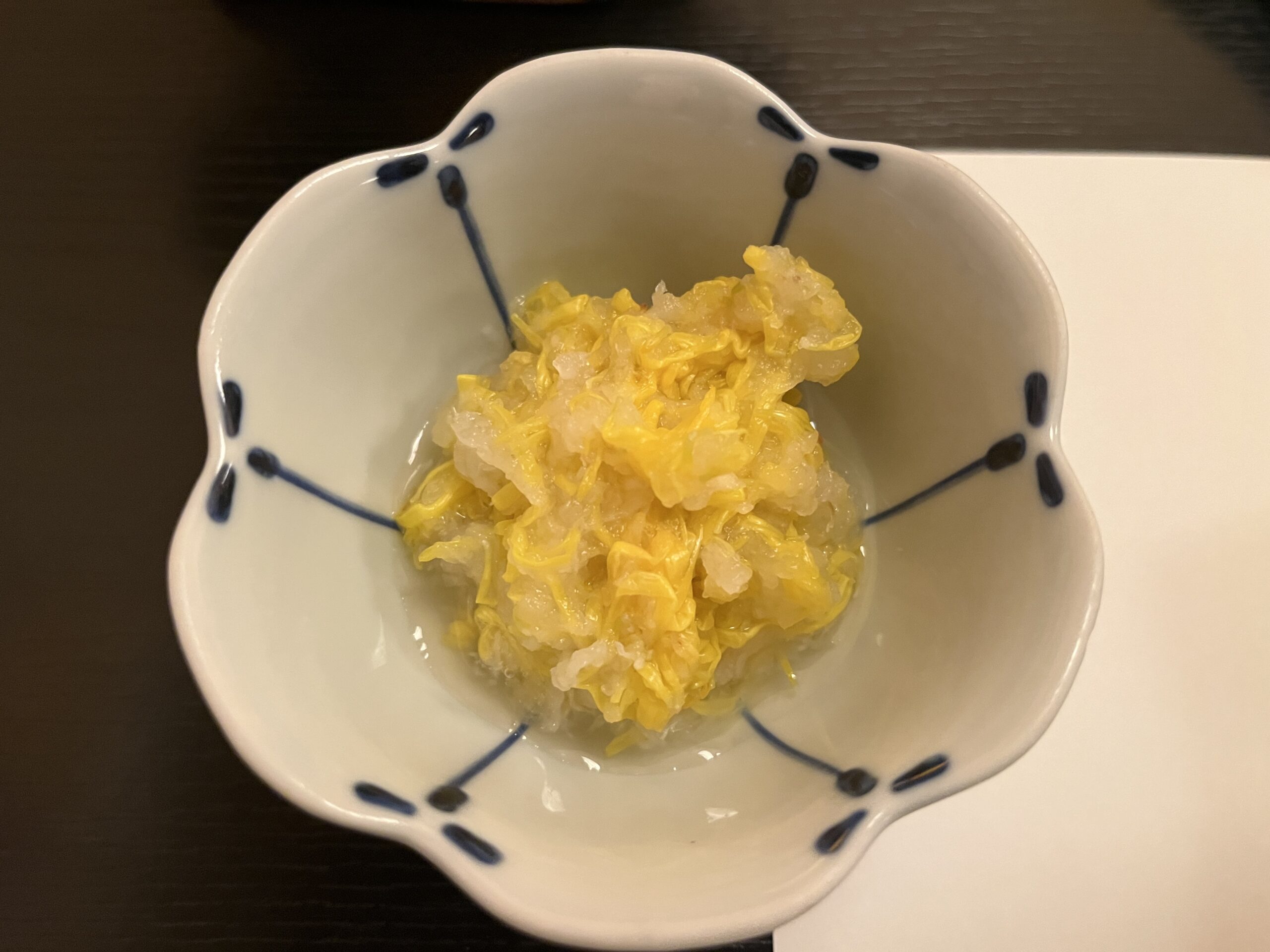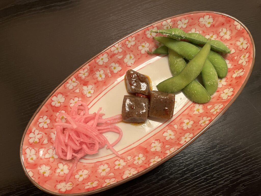 【前 菜】赤蕪。ピリ辛蒟蒻・枝豆