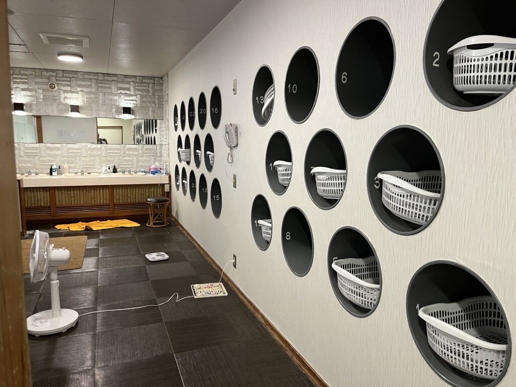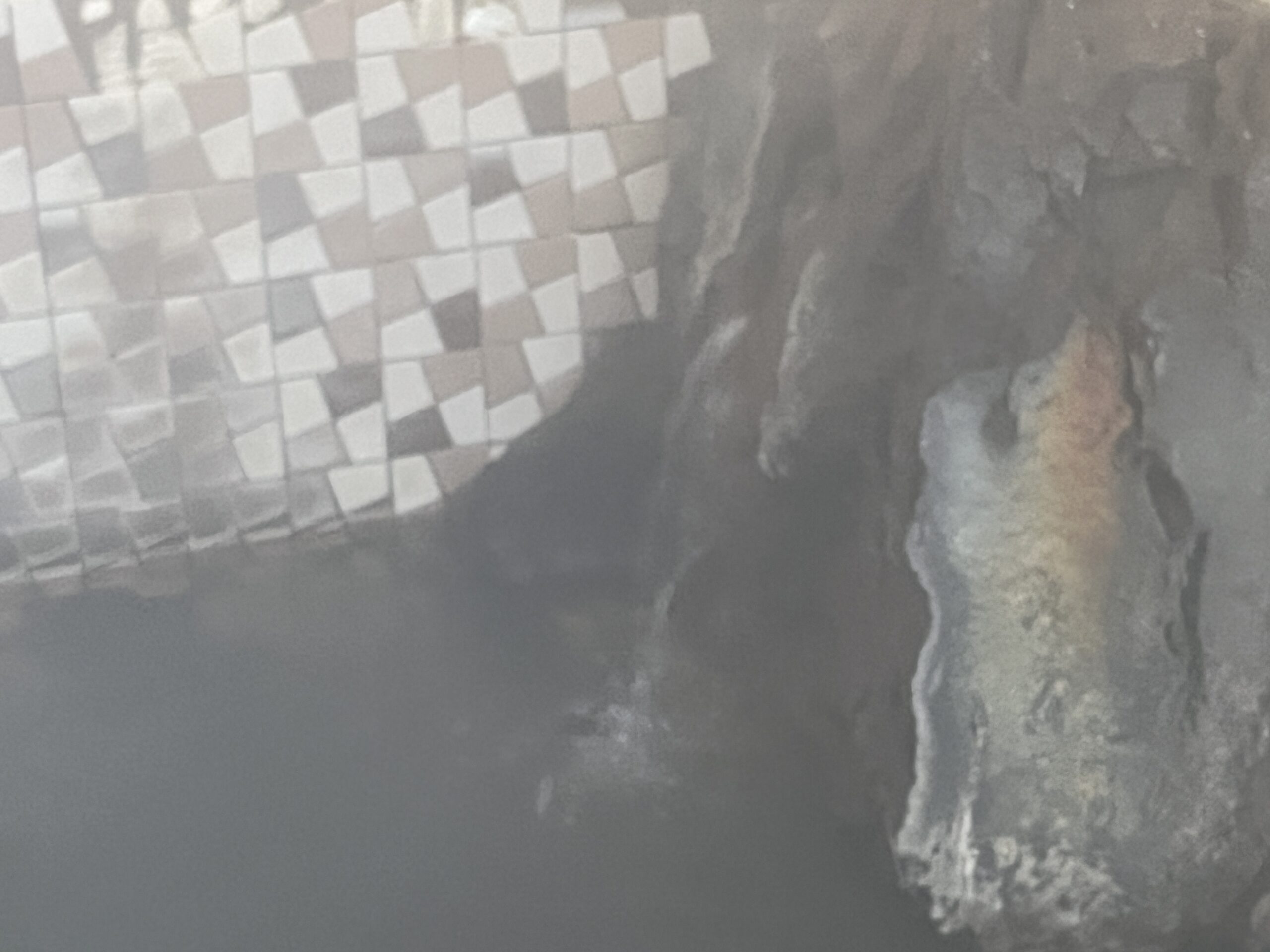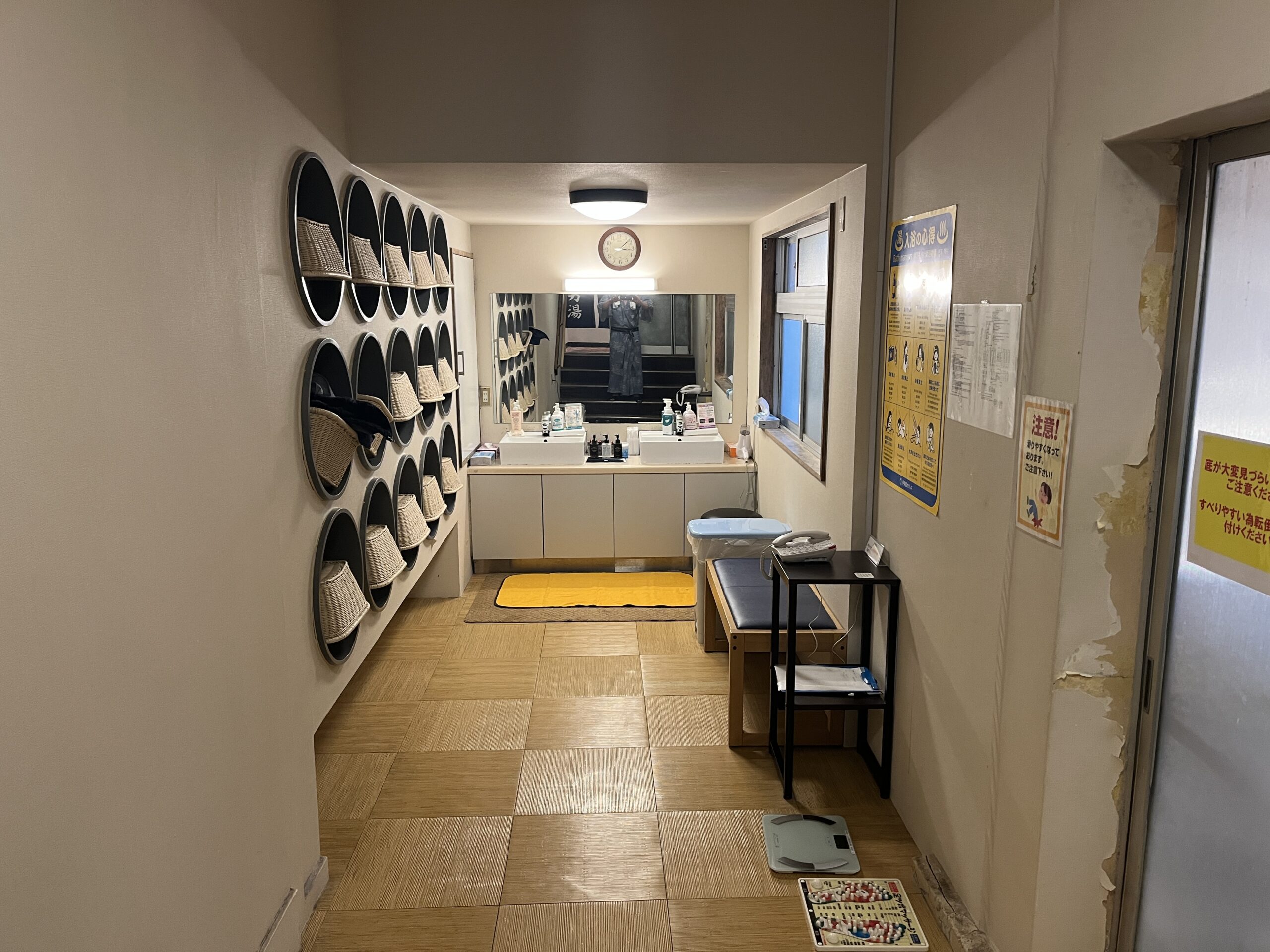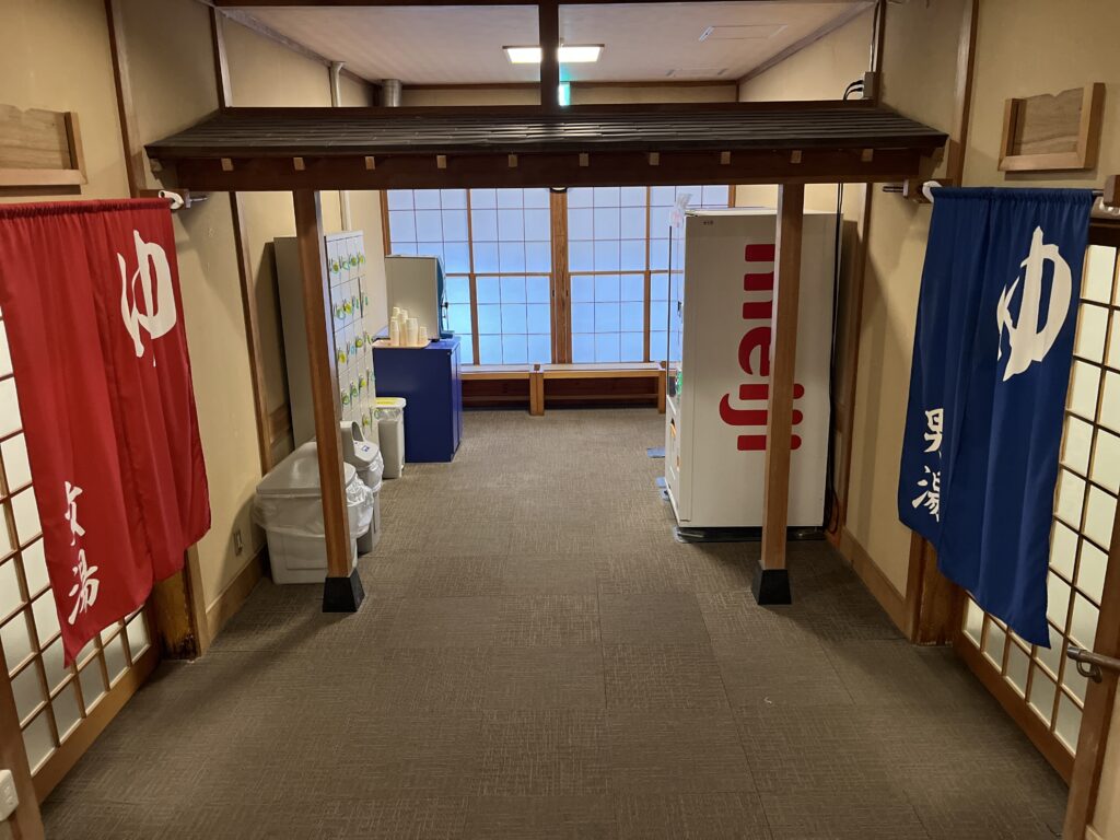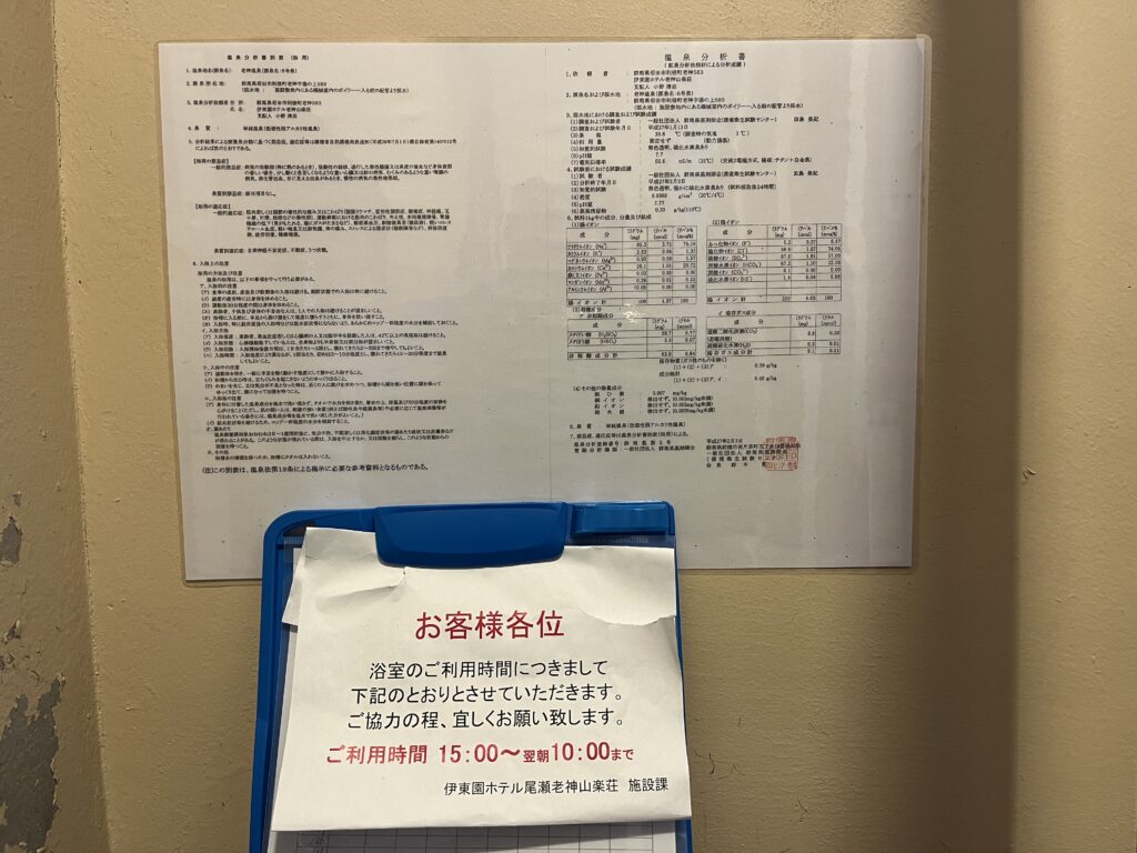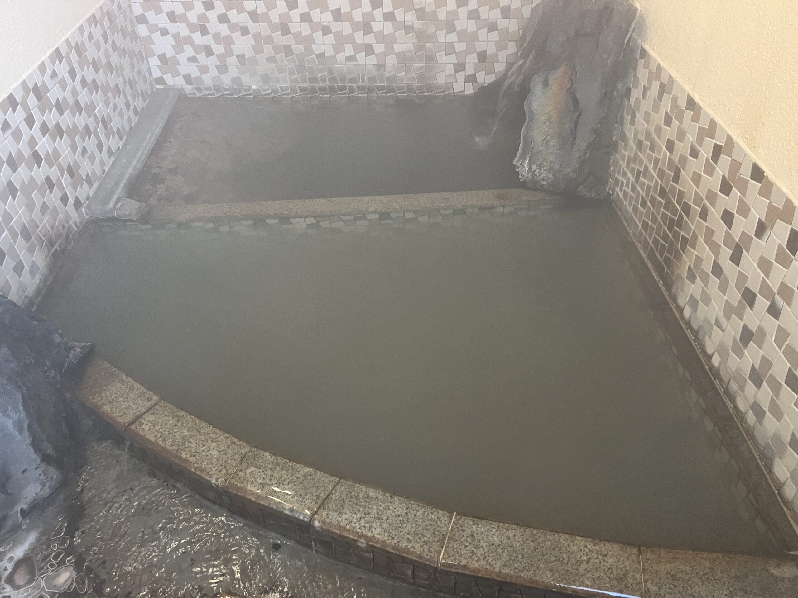部屋のお風呂は2つに仕切られて、温泉湧出口の浴槽から溢れて次の浴槽に流れ込む方式です。これが激熱で体感46℃以上はありました。残念ですがそのままでは入れず、ホースの水でうめてから浸かりました。