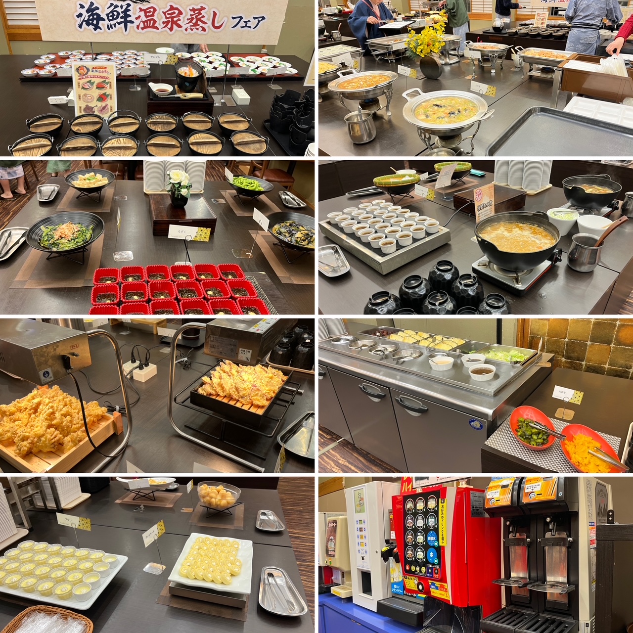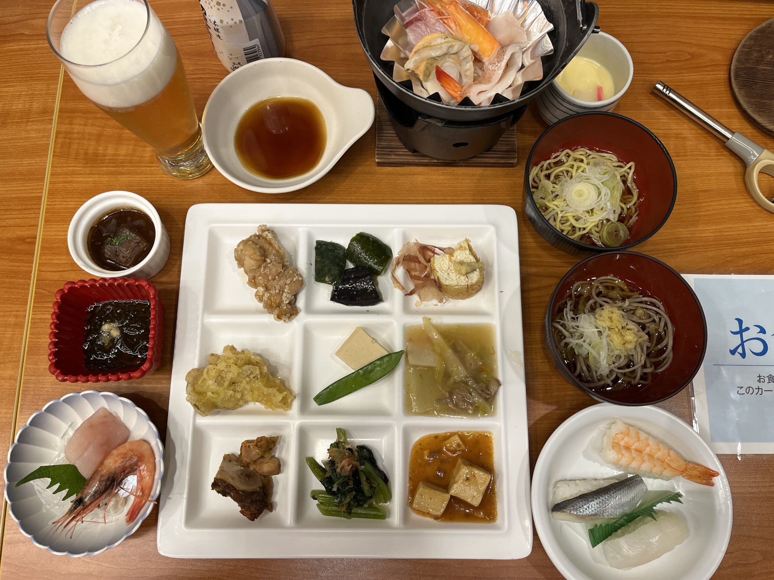 夕食は固形燃料の海鮮温泉蒸しが美味しかったです。写真用にいろいろ盛り付けたので、おかわりできなかったのが残念でした。飲み放題はビール1択!念願の部屋付き温泉にも入れて、今回の伊東園も大満足でした。