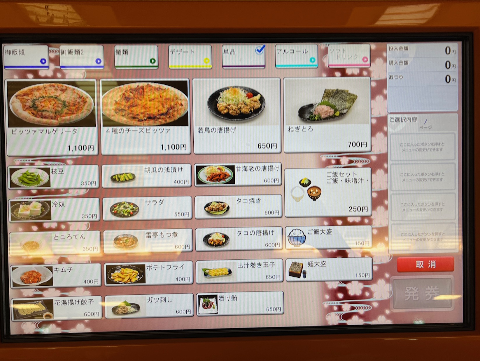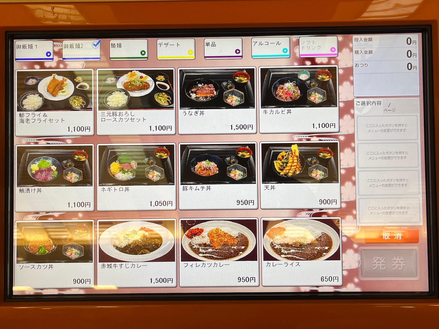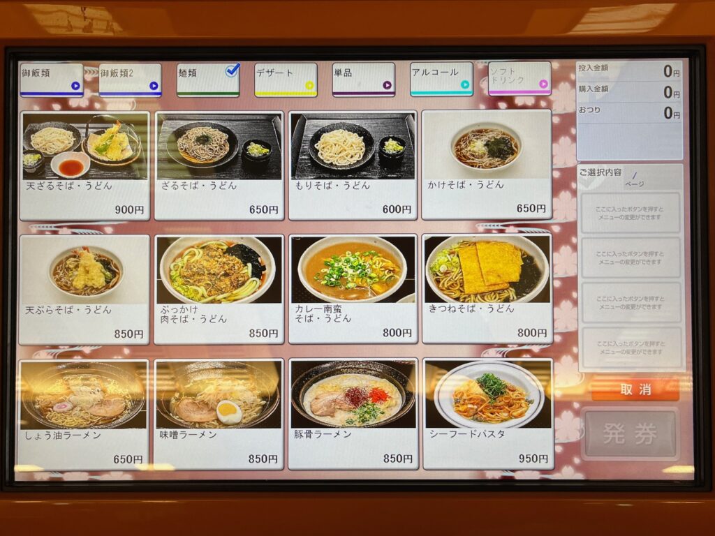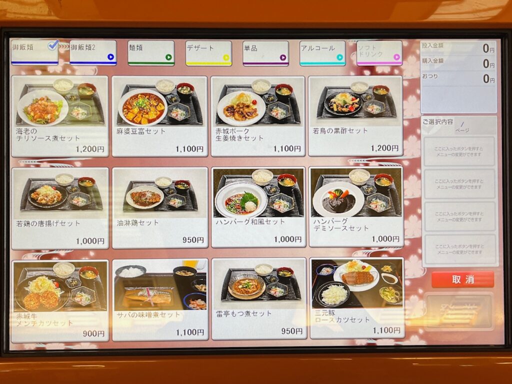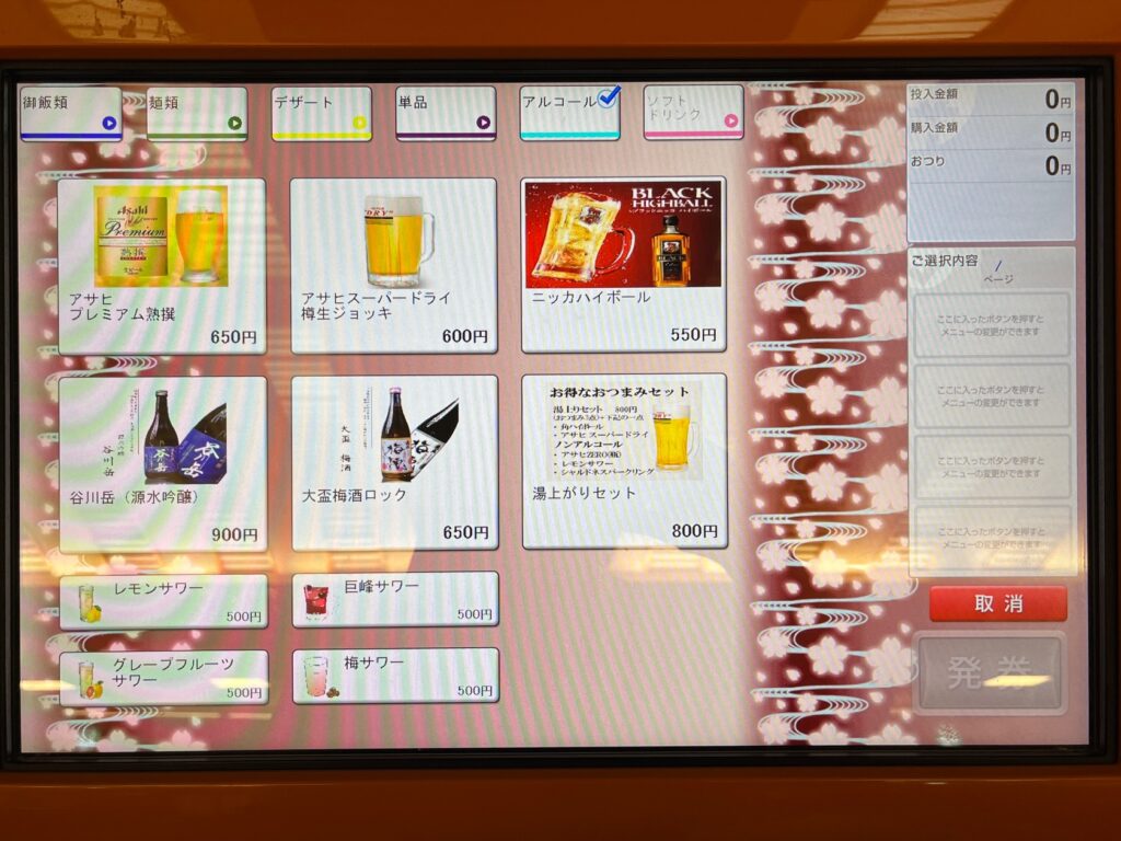 夕食付プランはありませんが、2階の食事処で食べられます。日帰りのお客様と一緒なので会席のような料理はありません。注文をしないのに券売機の写真だけ撮ってきたのでご覧ください。
