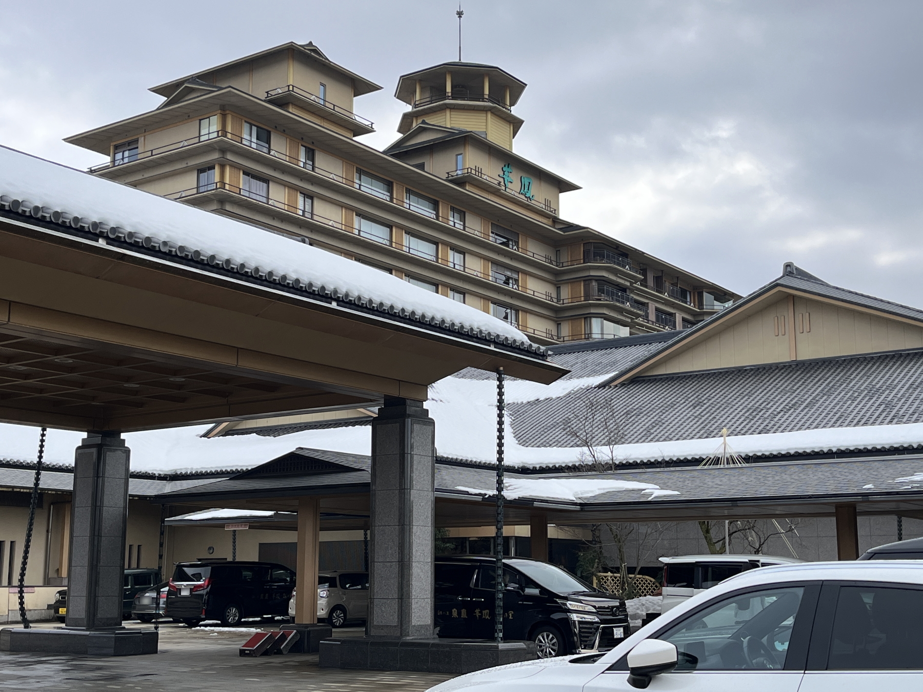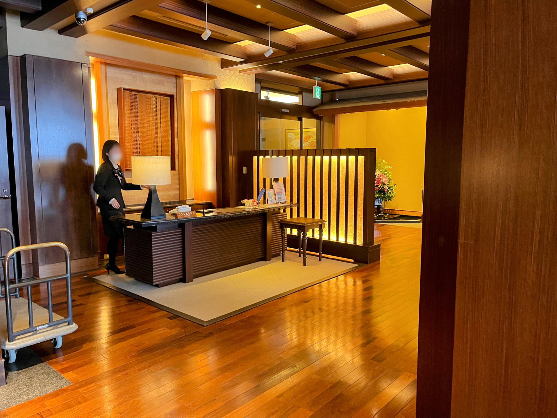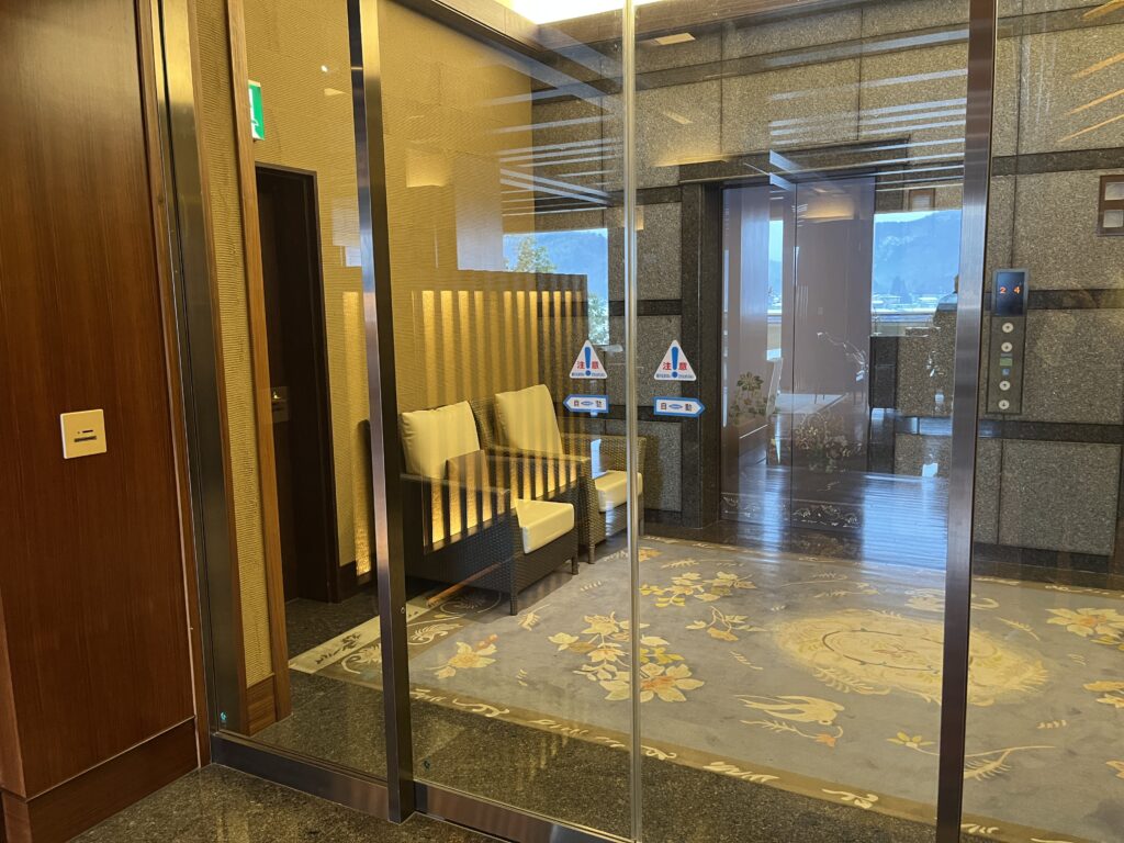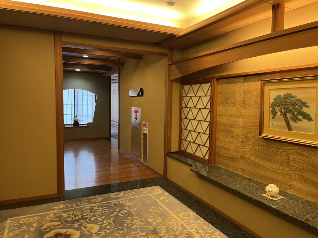 早めの到着でしたが「華鳳門」をくぐって坂を上ると、玄関前には着物の女性スタッフが台車を手に出迎えています。華鳳のラウンジでウェルカムドリンクを飲んでいると、紺色のスーツの越の里スタッフが迎えに来ました。