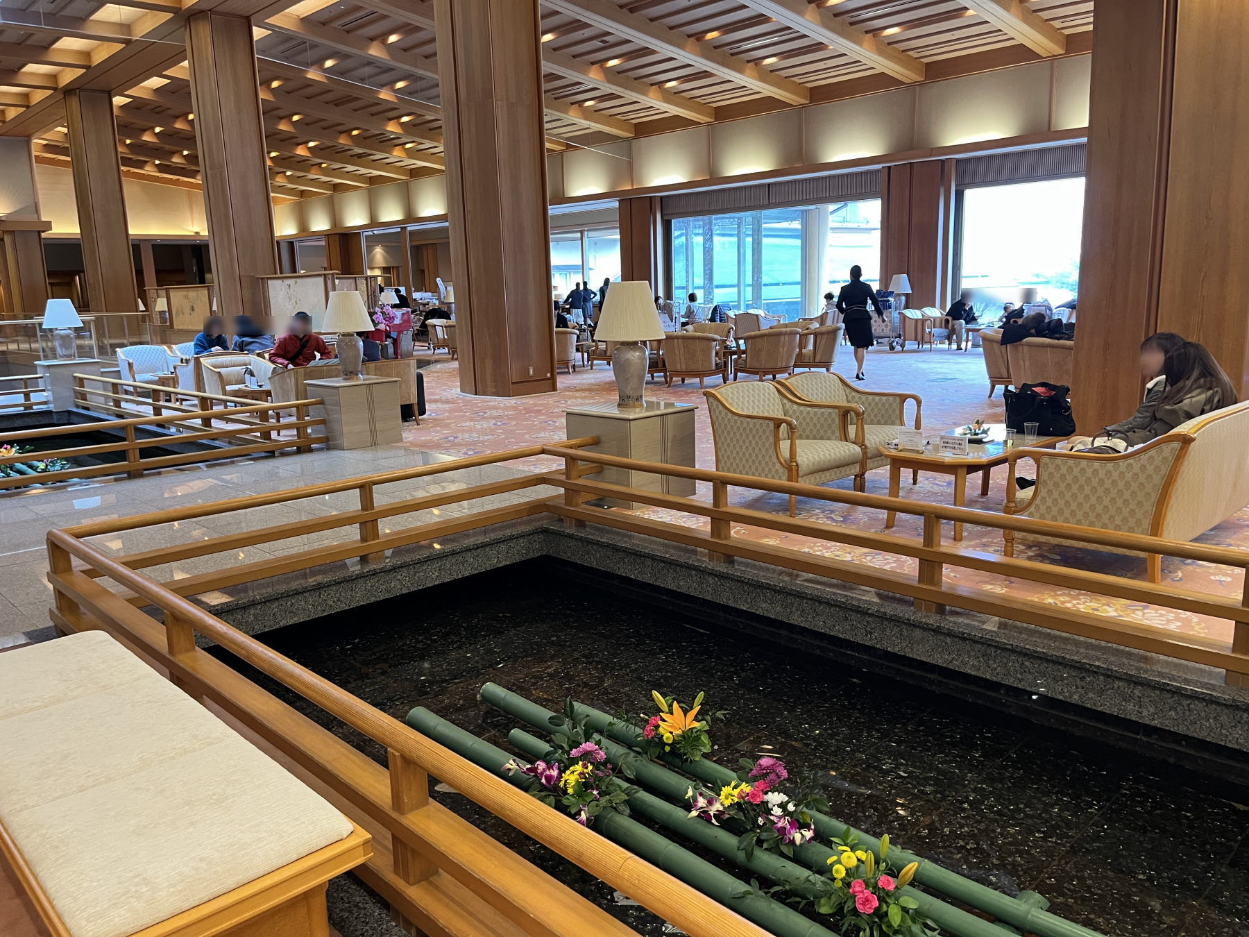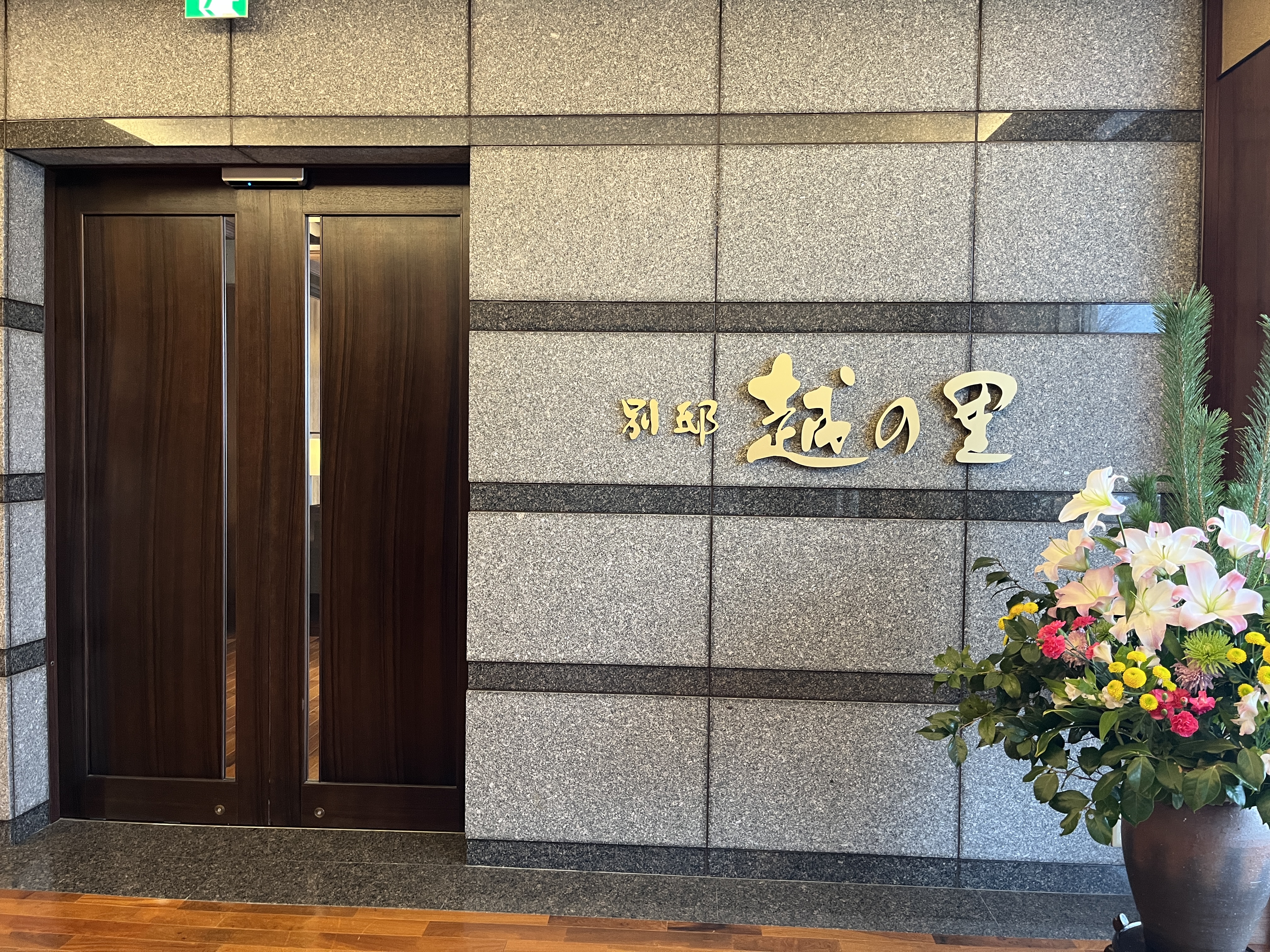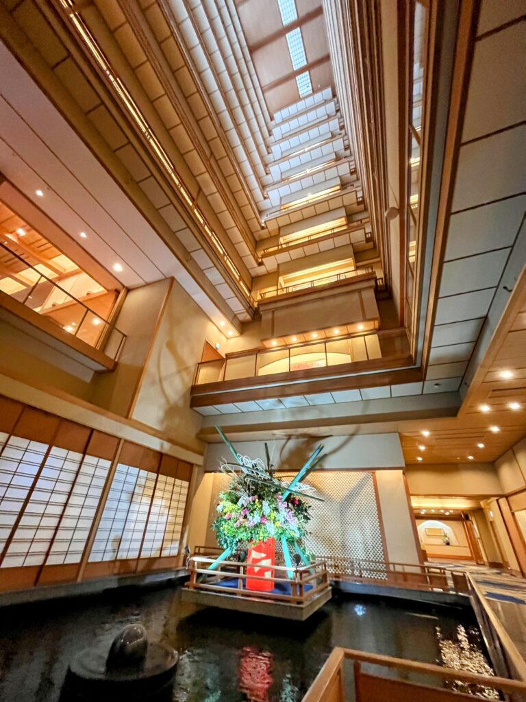 早めの到着でしたが「華鳳門」をくぐって坂を上ると、玄関前には着物の女性スタッフが台車を手に出迎えています。華鳳のラウンジでウェルカムドリンクを飲んでいると、紺色のスーツの越の里スタッフが迎えに来ました。