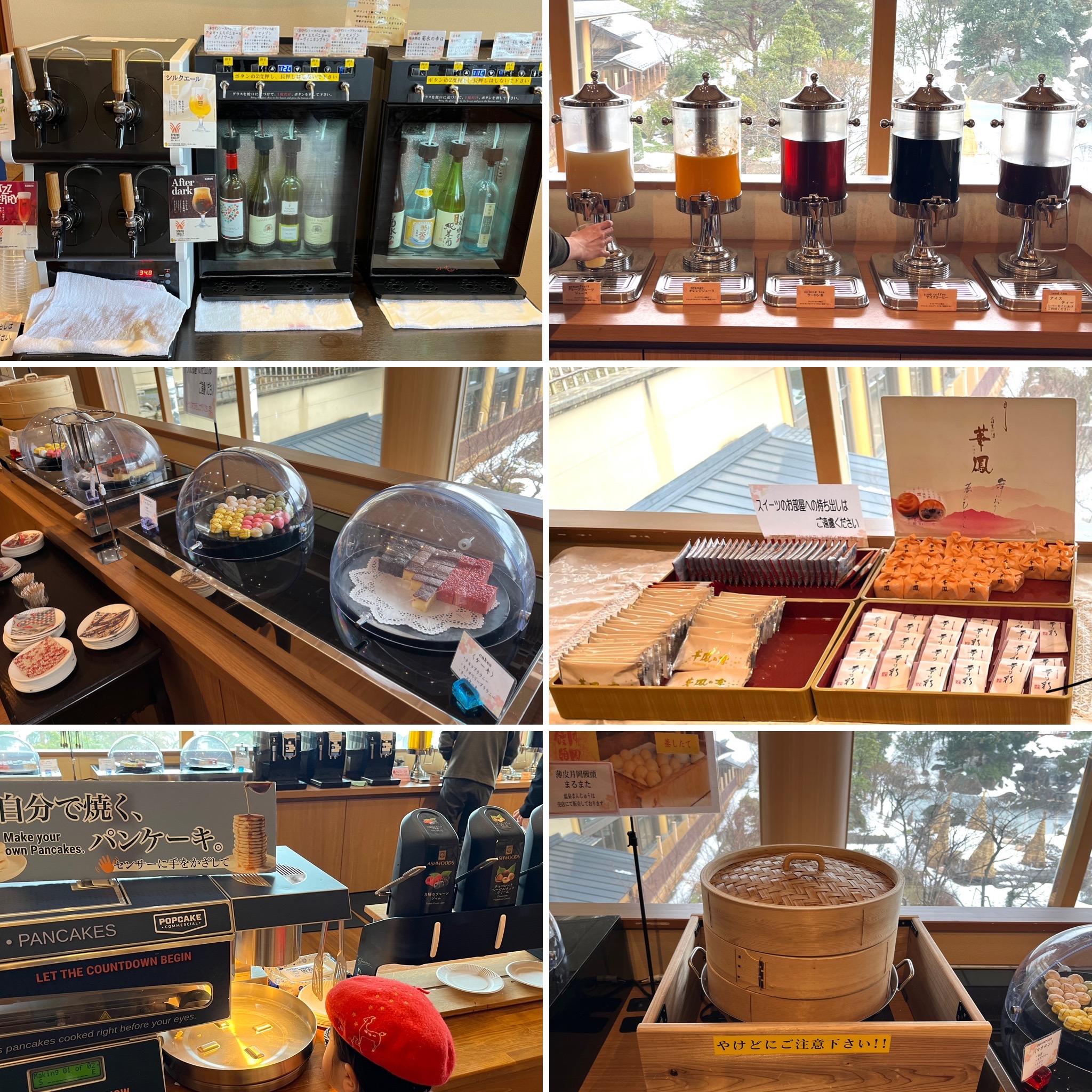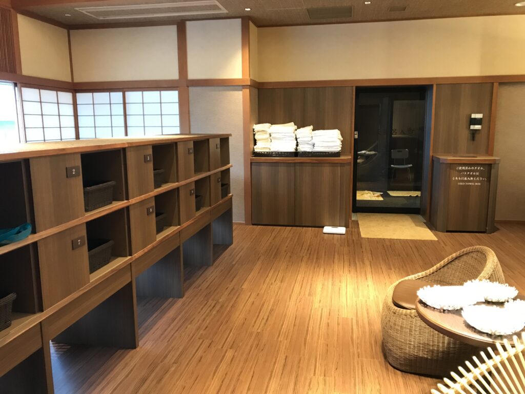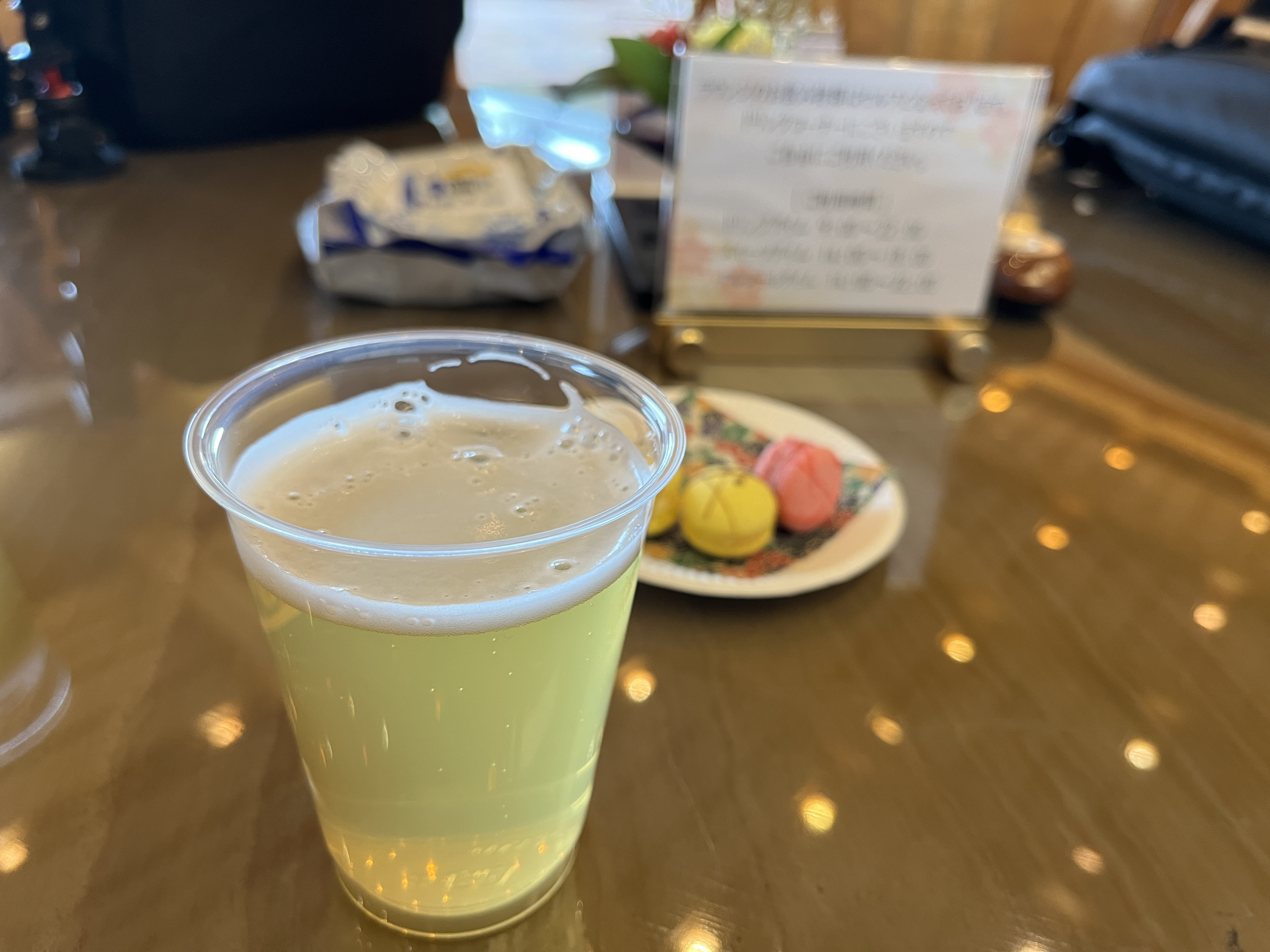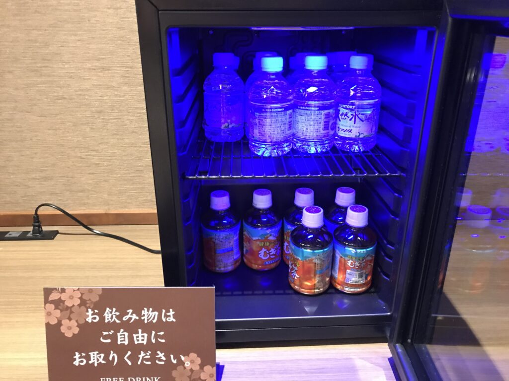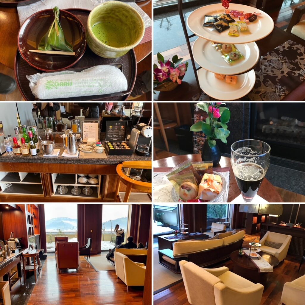 大きなコンベンションホール横の通路の先が「越の里」の入り口です。ドアを開けるとコンシェルジュのデスクとミニラウンジがあります。抹茶と和菓子をいただきましたが、お酒やお洒落なスイーツが沢山ありました。