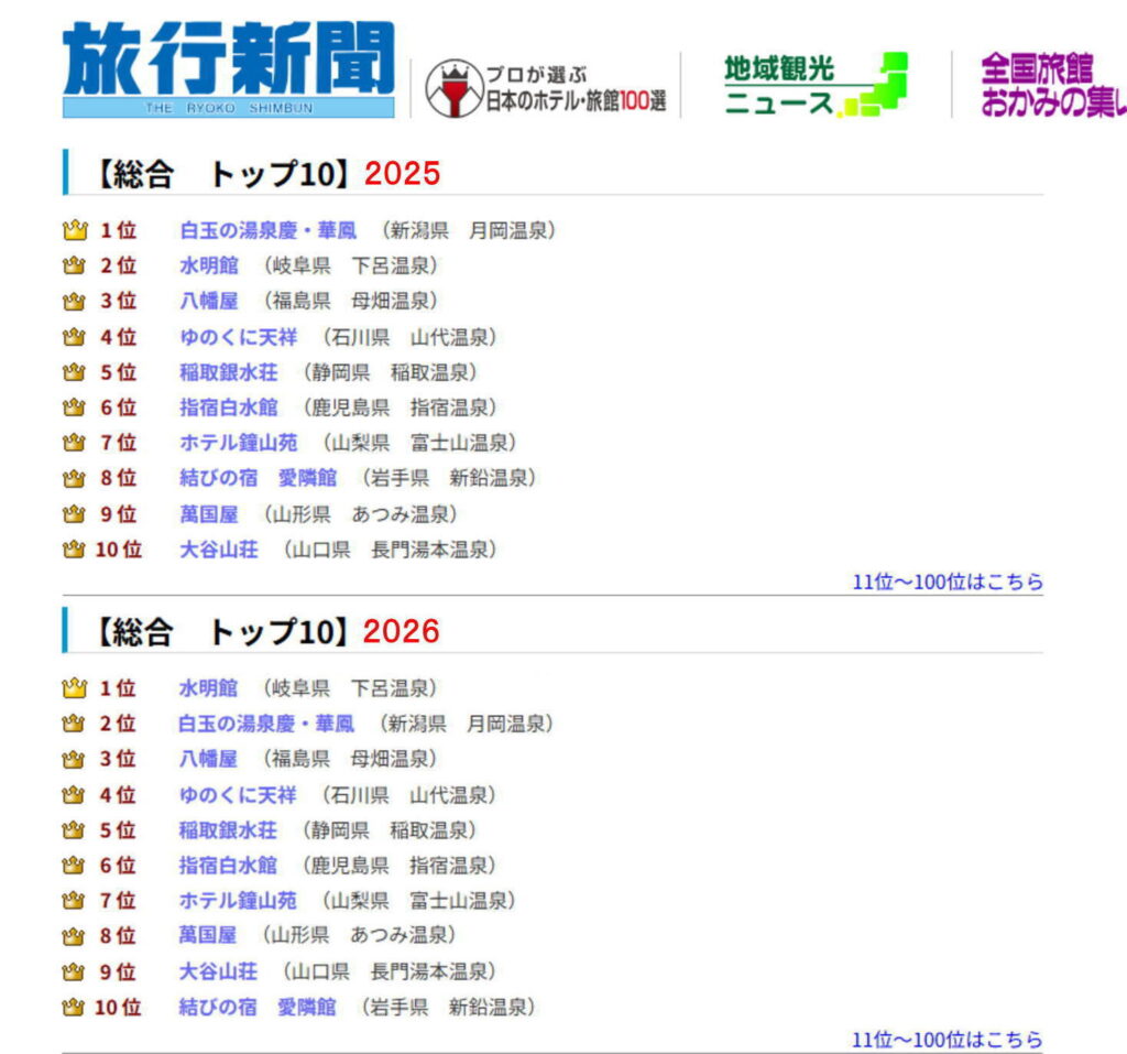 日本にある旅館の数は約40,000軒。そのなかから日本の旅行会社(約14,000カ所)へのアンケートをもとに、年1度「旅館100選」を発表しています。