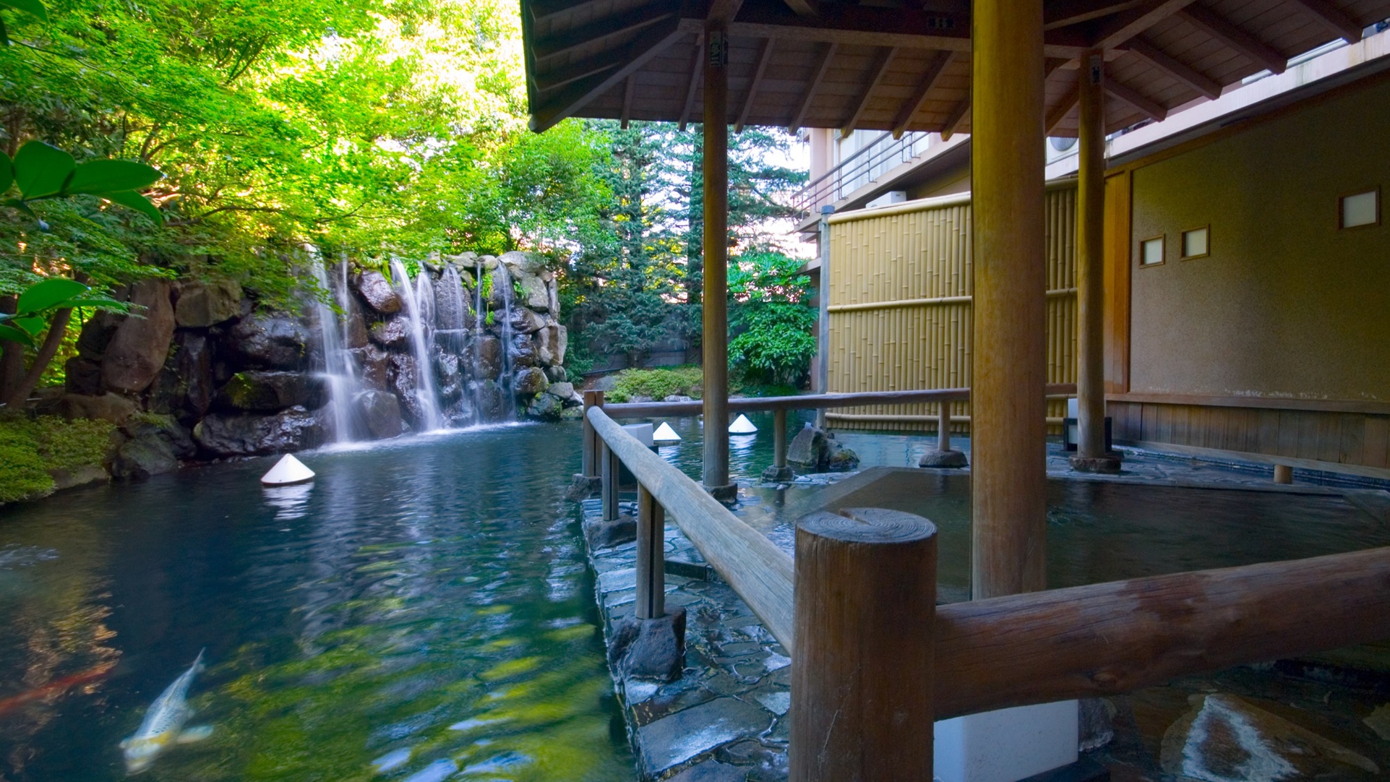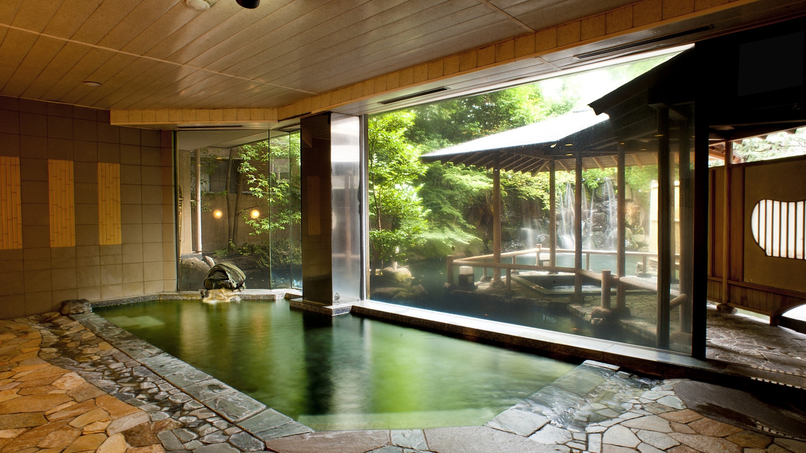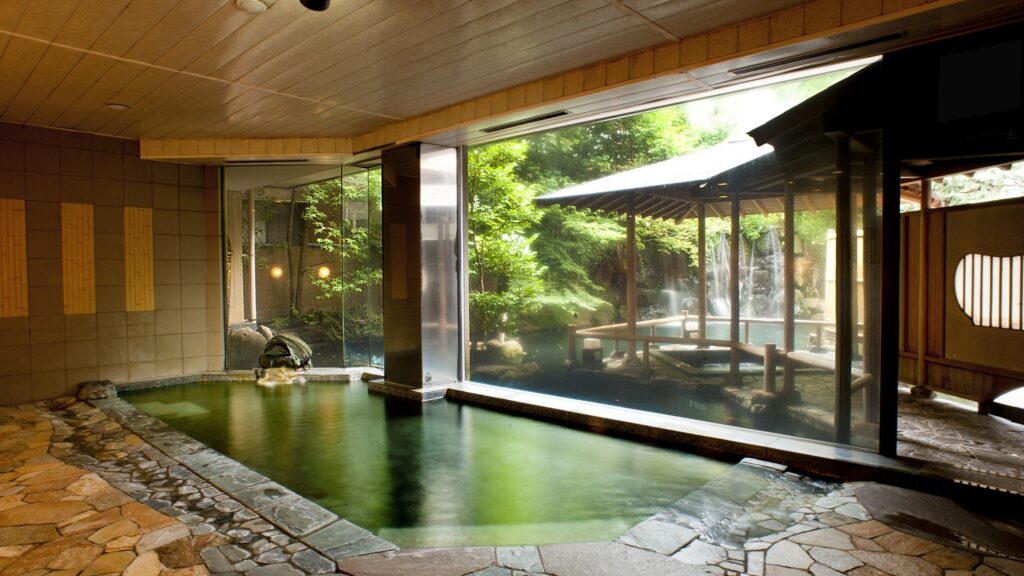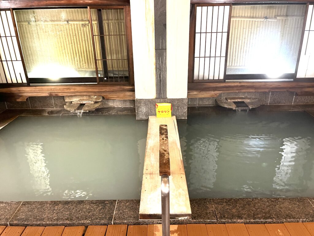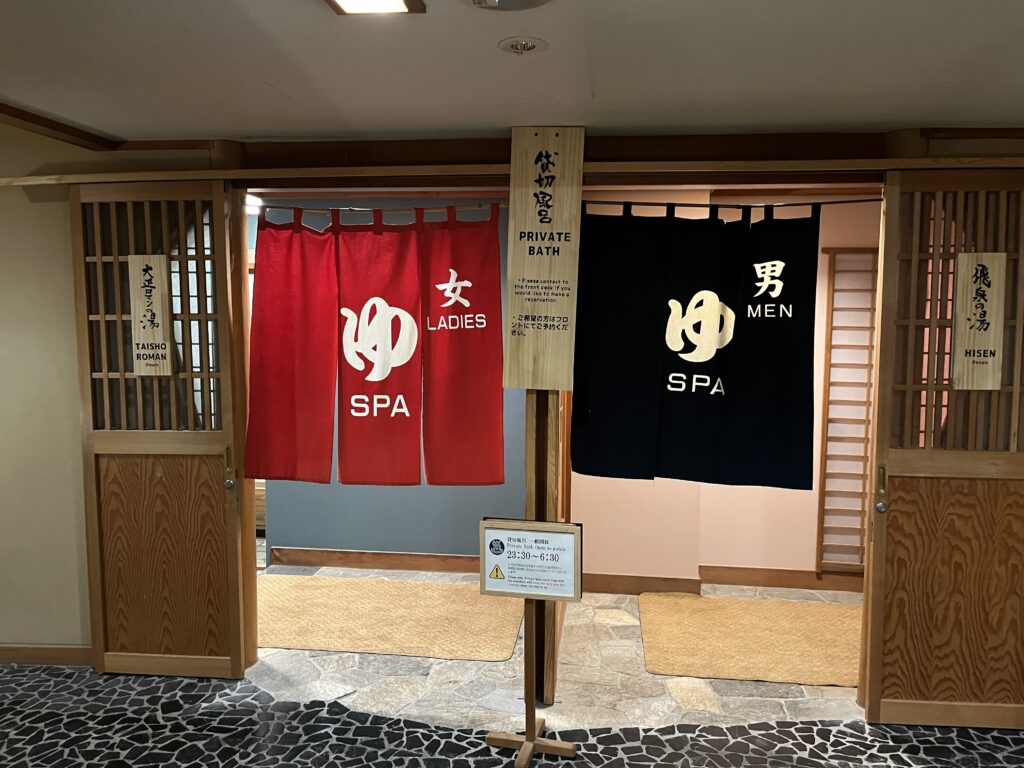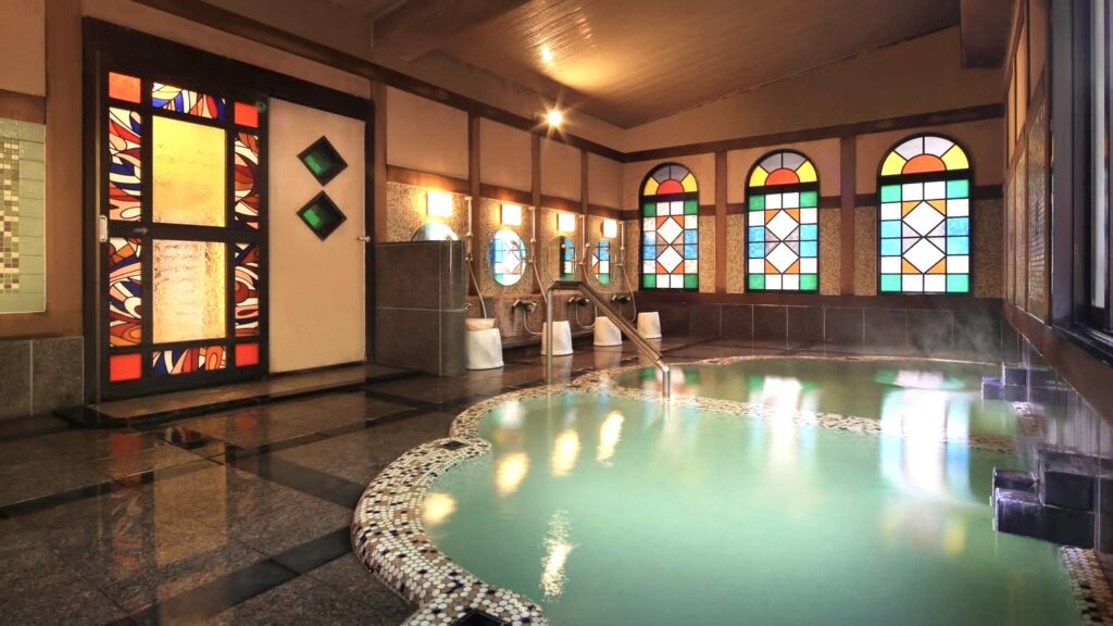 温泉は淡く白濁した硫黄泉で硫化水素の香りが漂います。露天風呂『聴瀧の湯』は滝が流れ落ちる池に浮かぶような景観です。ステンドグラスが鮮やかな「大正ロマンの湯」は貸切風呂になっていましたが、23:30~6:30まで女性は無料で使えます。(大正ロマンの湯は男性の無料時間がないので貸切時間のみ50分5,500円)