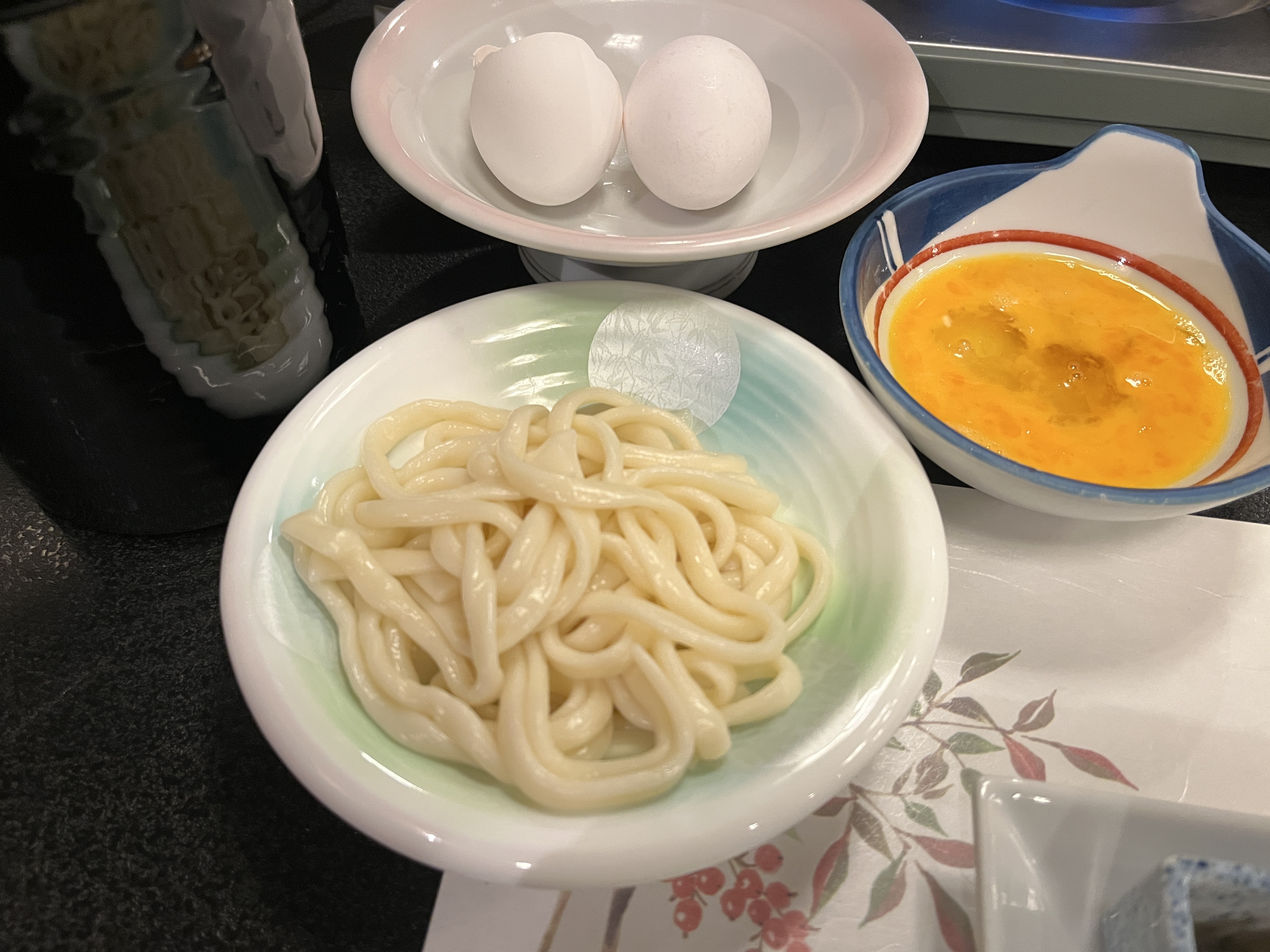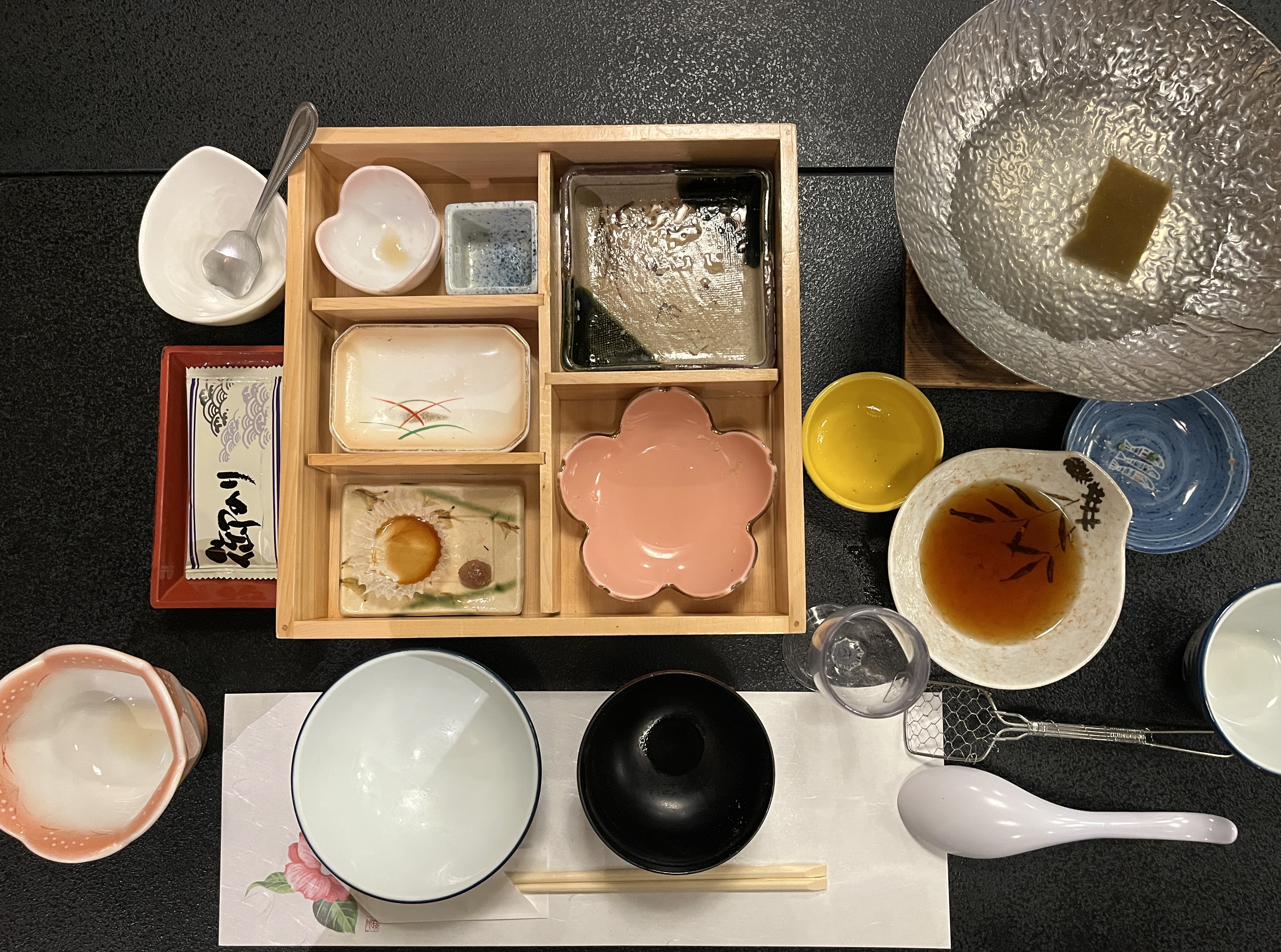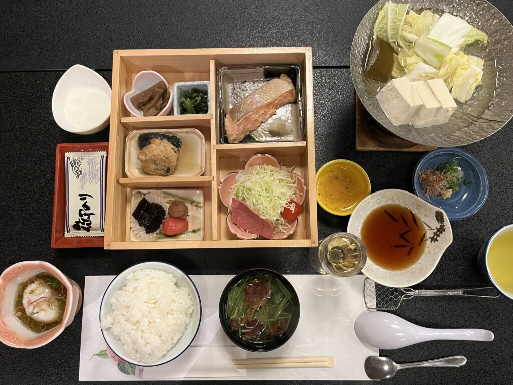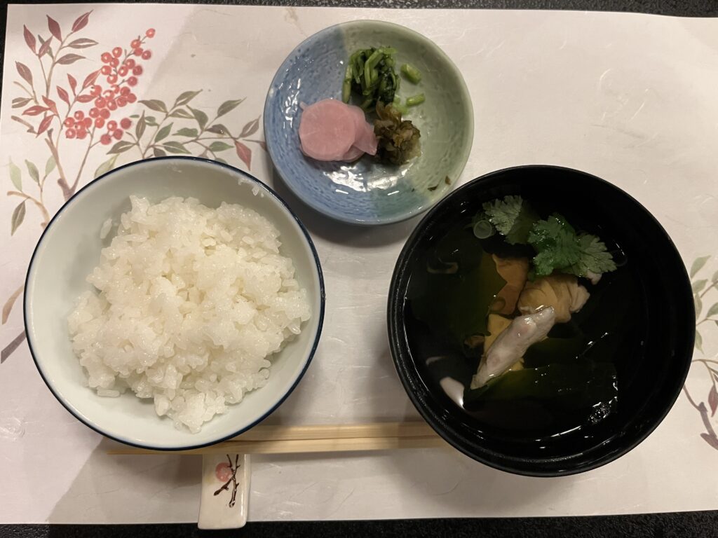 先付に鶏つくね・海月の酢の物・鮎のマリネ、あとは茶碗蒸しとお吸い物。うどんと釜炊きのご飯でおなか一杯になりました。デザートはないと判断して、部屋に帰ったので食べそこねました。