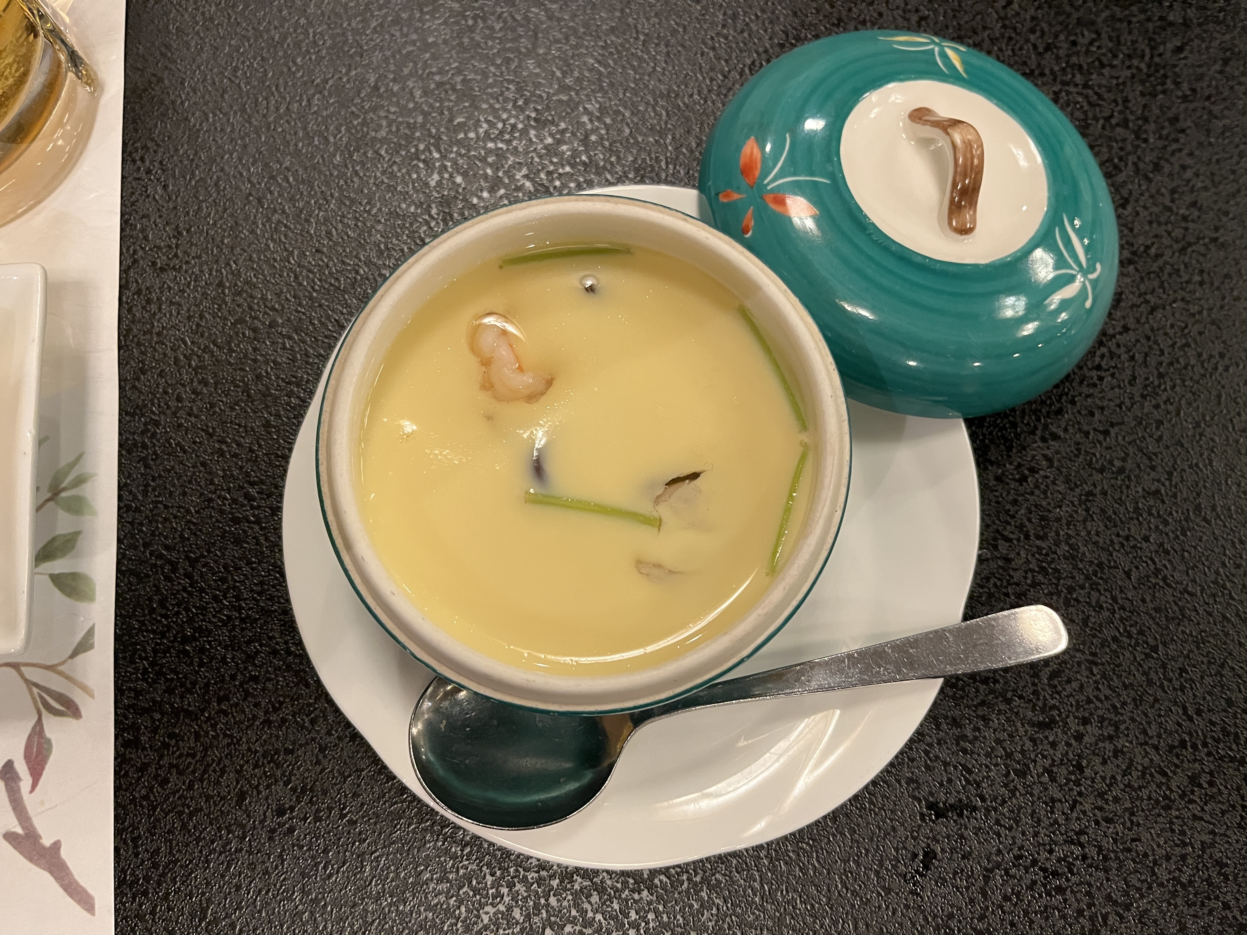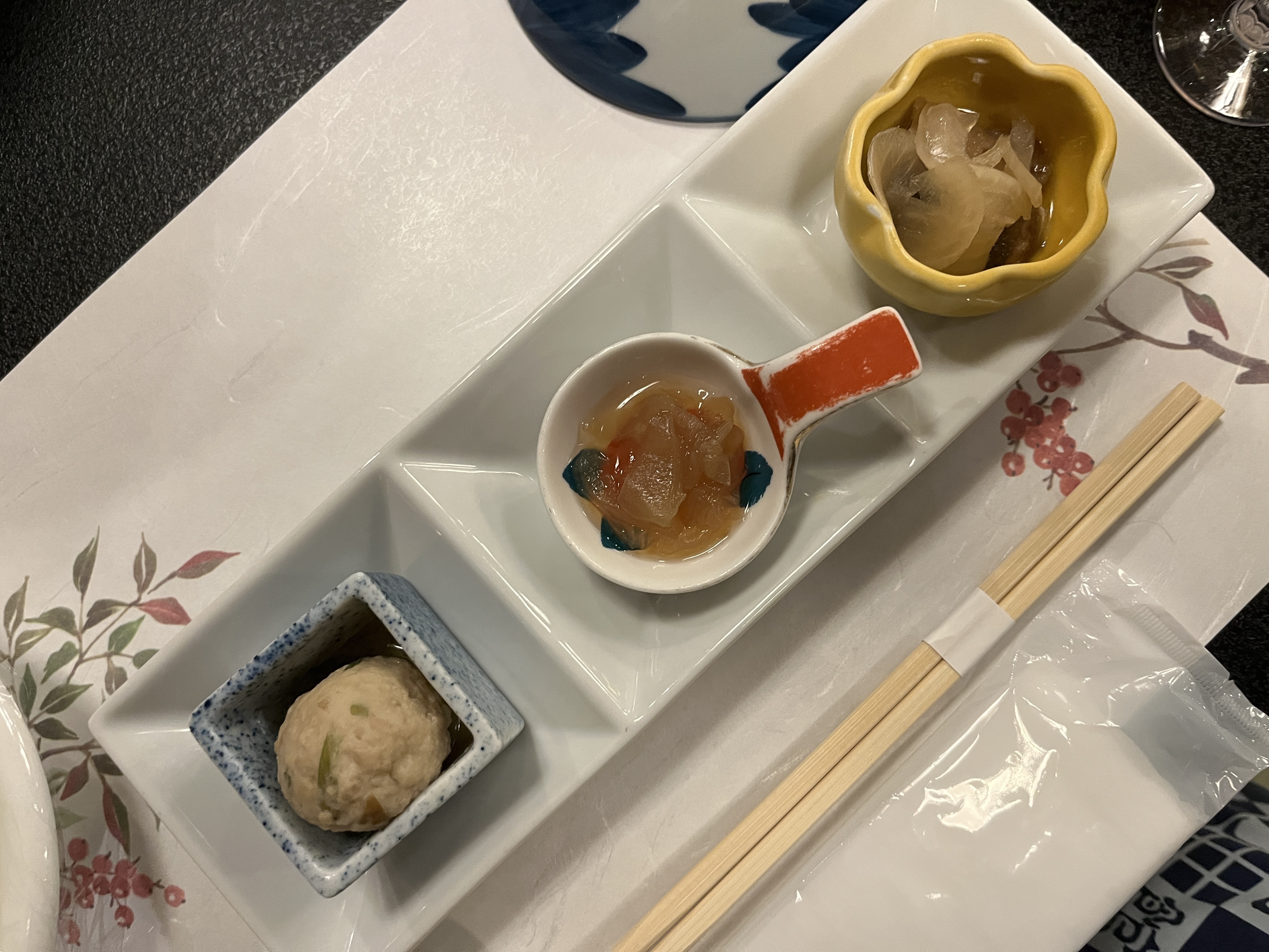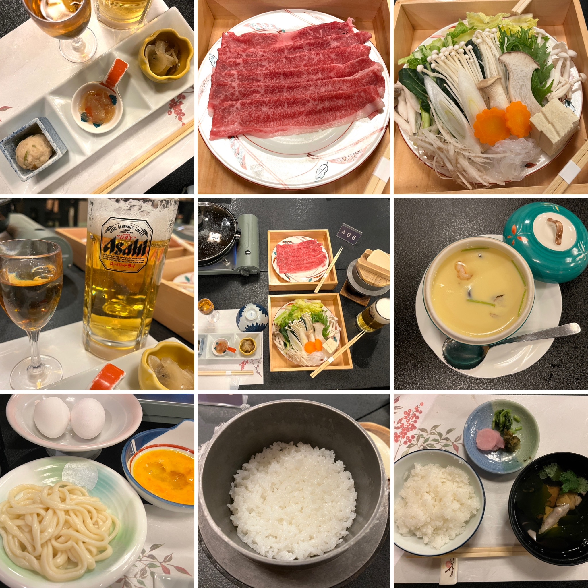 先付に鶏つくね・海月の酢の物・鮎のマリネ、あとは茶碗蒸しとお吸い物。うどんと釜炊きのご飯でおなか一杯になりました。デザートはないと判断して、部屋に帰ったので食べそこねました。